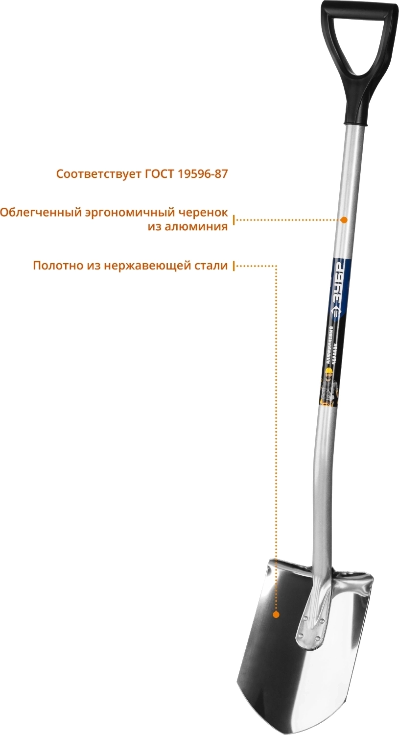 Штыковая лопата -4 ЗУБР Артель-НС 280 х 190 х 1200мм полотно 2 мм закалено нержавеющая сталь алюминиевый изогнутый черенок