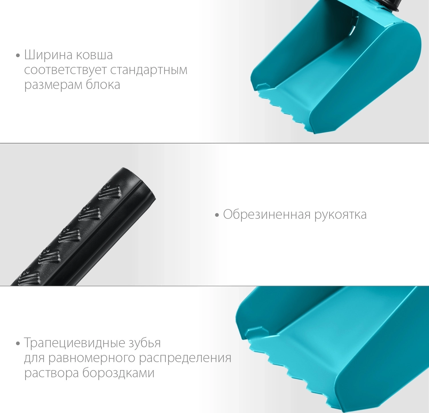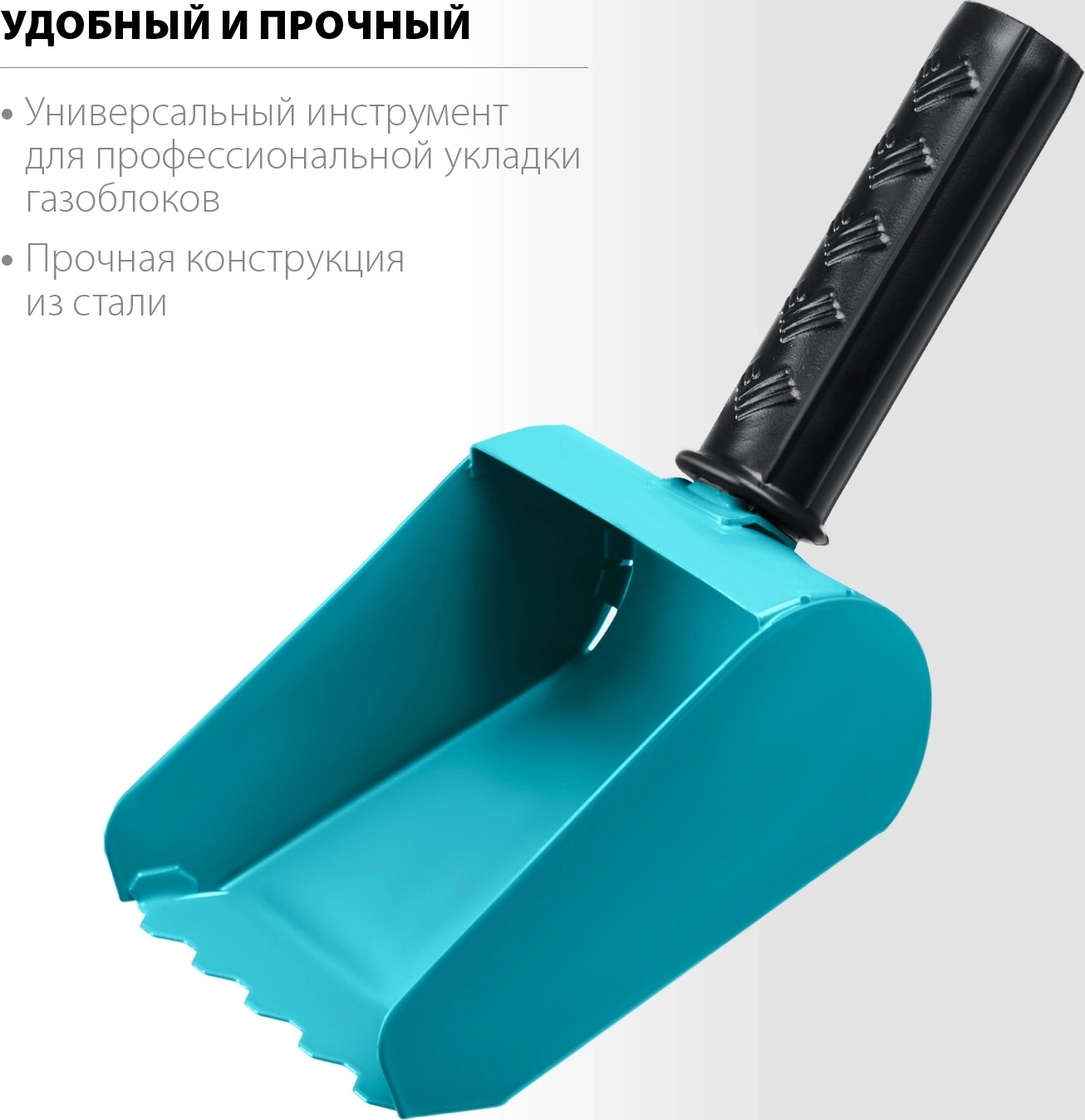 Универсальная металлическая КЕЛЬМА-КОВШ для профессиональной укладки газоблоков, обрезиненая рукоятка, из стали 1,3 мм. Прочная сварная конструкция. Специальные зубья для создания ровных трапециевидных бороздок из раствора.