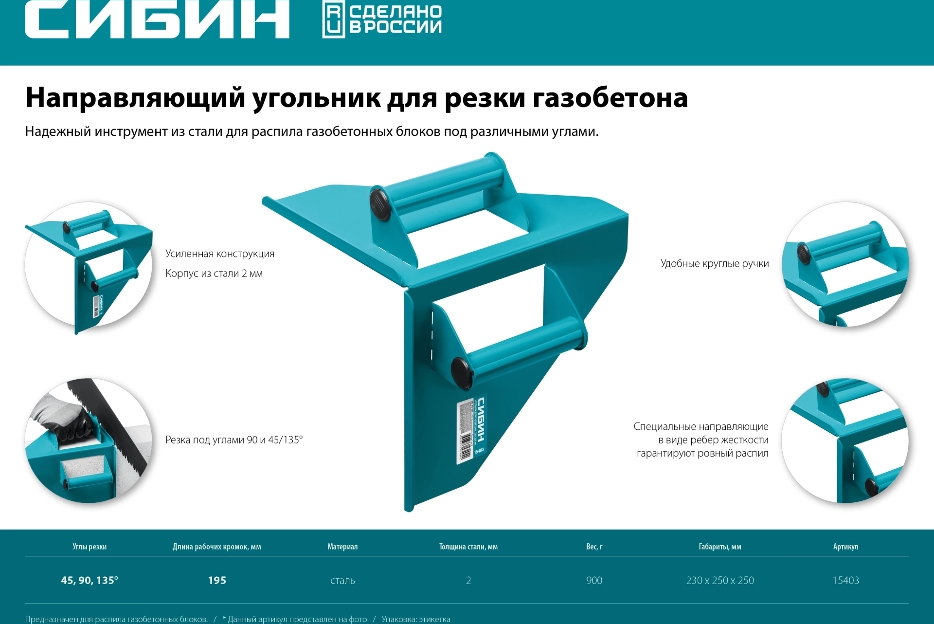 Направляющий угольник для резки газобетона СИБИН 200 х 200 мм, 900 г