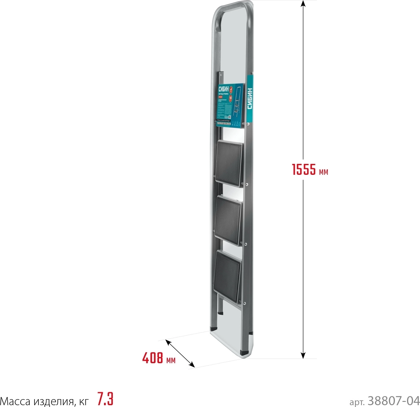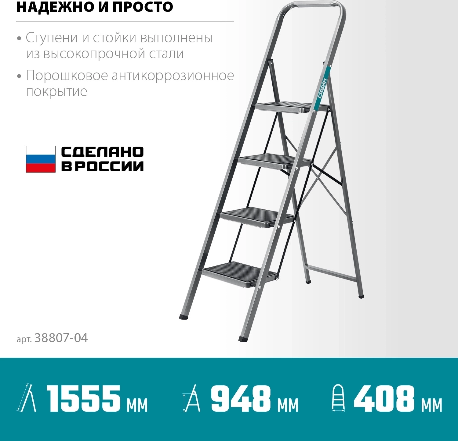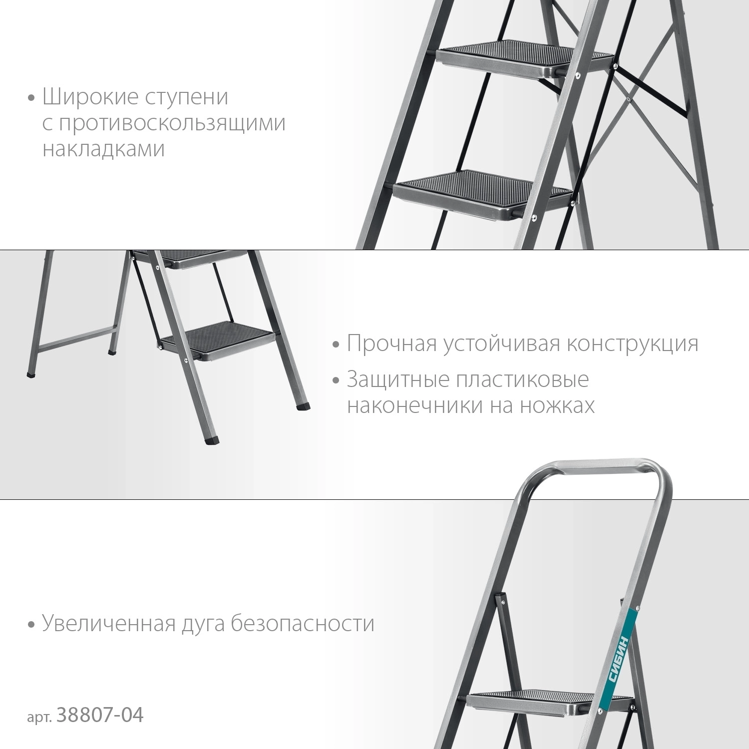 Стальная стремянка СИБИН 4 ступени, 95 см, c широкими обрезиненными ступенями