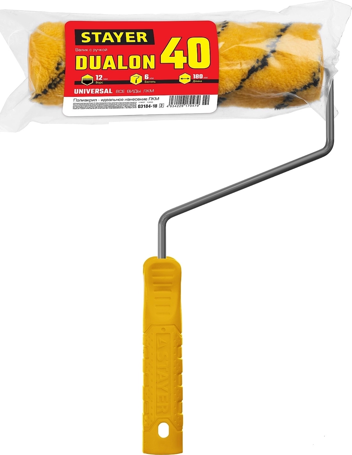 Малярный валик STAYER DUALON, 40 х 180 мм, бюгель 6 мм, ворс 12 мм, полиакрил, все виды ЛКМ