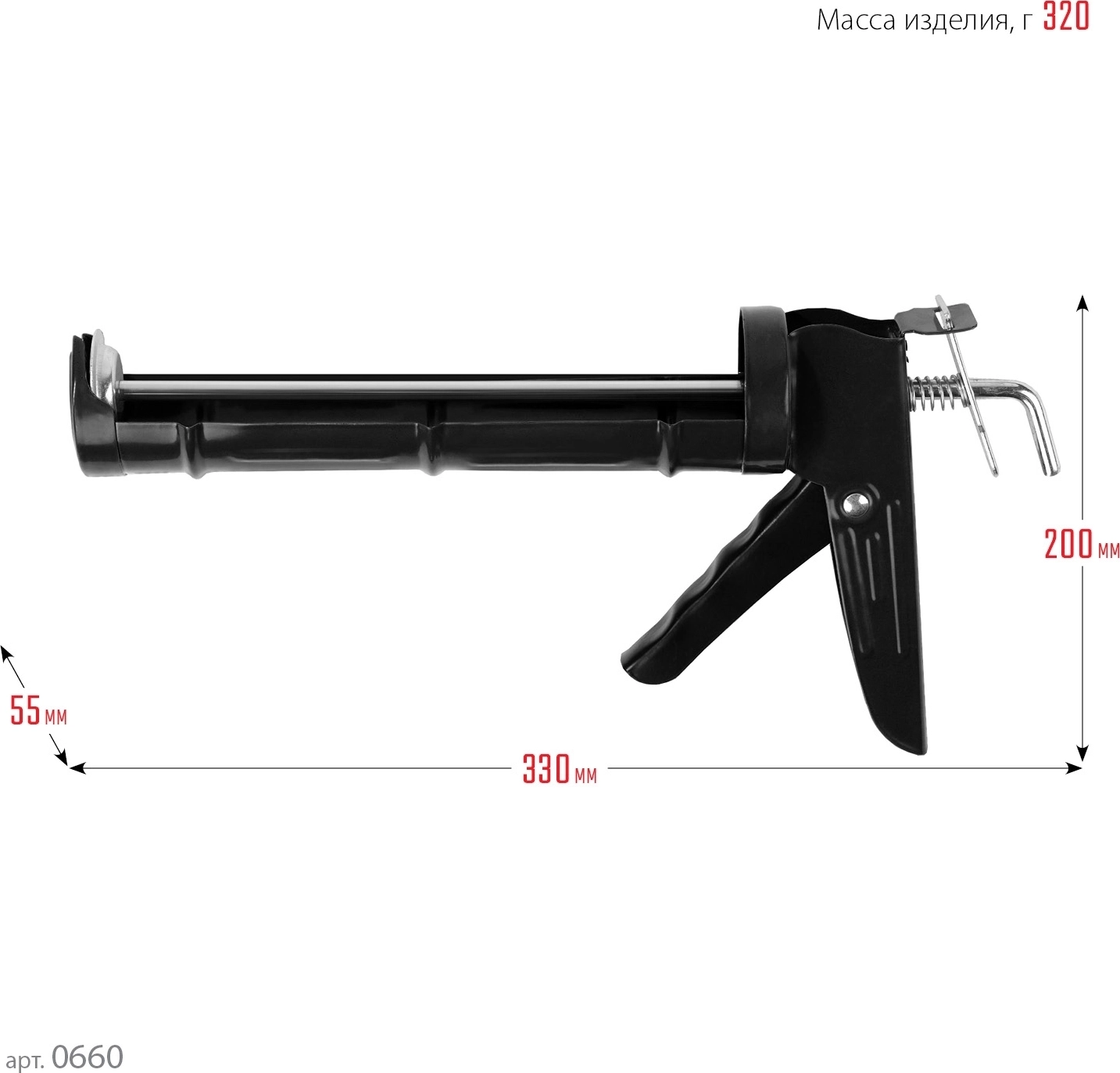 Пистолет для герметиков подходит для работы с картриджами объемом 310 мл, имеет полуоткрытый крашенный стальной корпус, зубчатый шток из оцинкованной стали способствуют равномерной подачи клея либо герметика. Данная спецификация обеспечивает прочность и надежность конструкции пистолета при использовании.