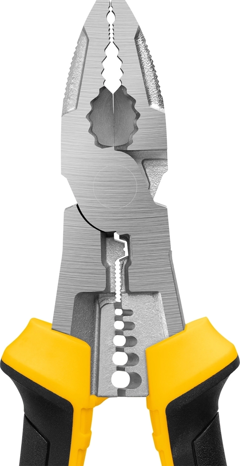 - 8 функций: захват плоских деталей, захват круглых деталей, захват гаек 20 мм, удержание гвоздей и проволоки, зажим с мощным рычагом, кримпер, съемник изоляции, кусачки