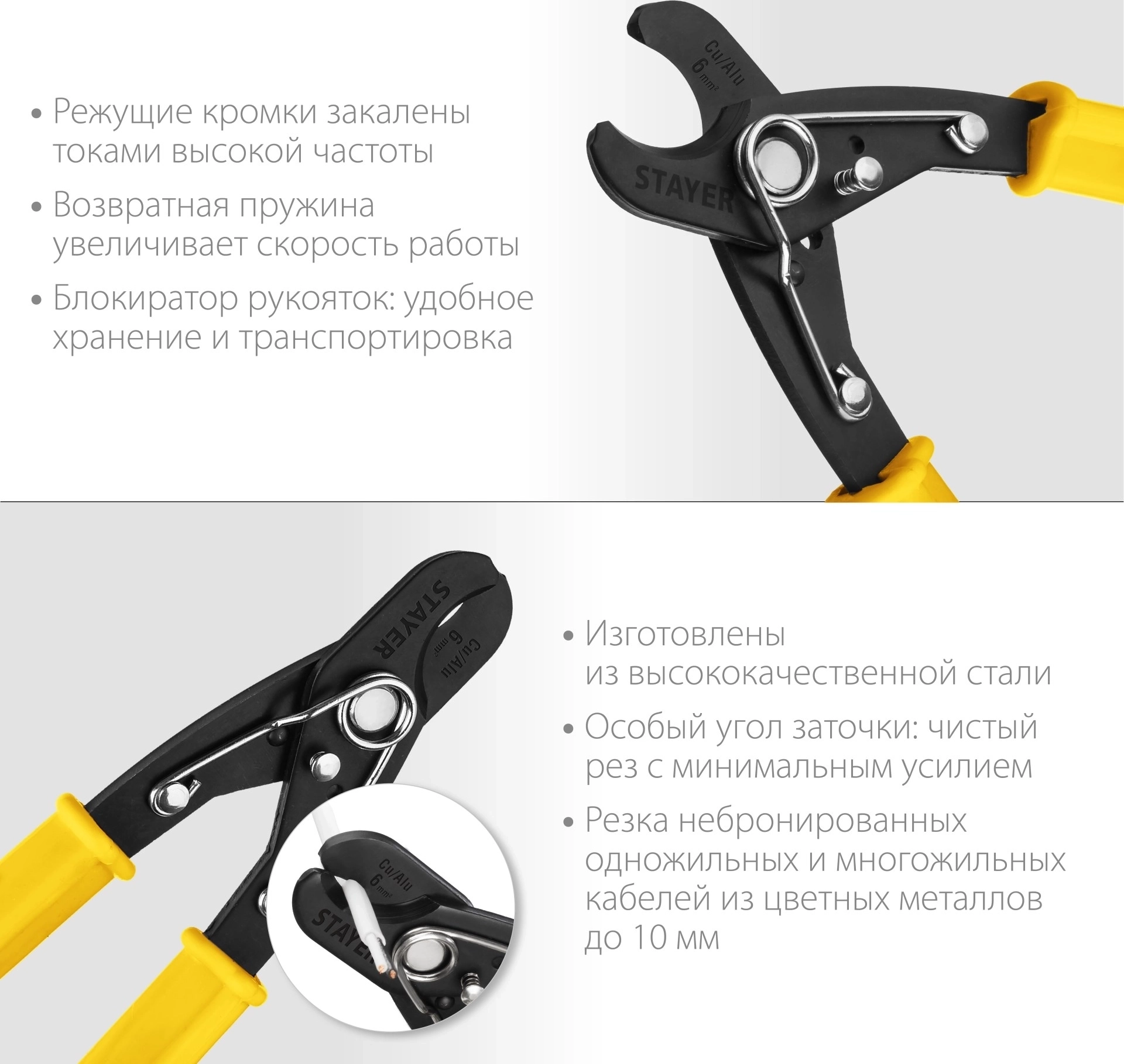 Кабелерезы STAYER изготовлены из высококачественной стали и предназначены для резки небронированного одножильного и многожильного кабеля из цветных металлов ( Cu + Al ) без деформации и замятия краев.