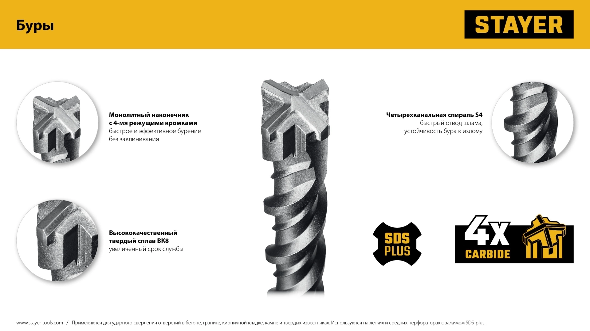 Буры STAYER HERCULES-4Х - надежный инструмент, отвечающий самым высоким требованиям качества и для любой сложности работ. Применяются при сверлении отверстий в бетоне, граните, кирпичной кладке, камне и твердых известняках.