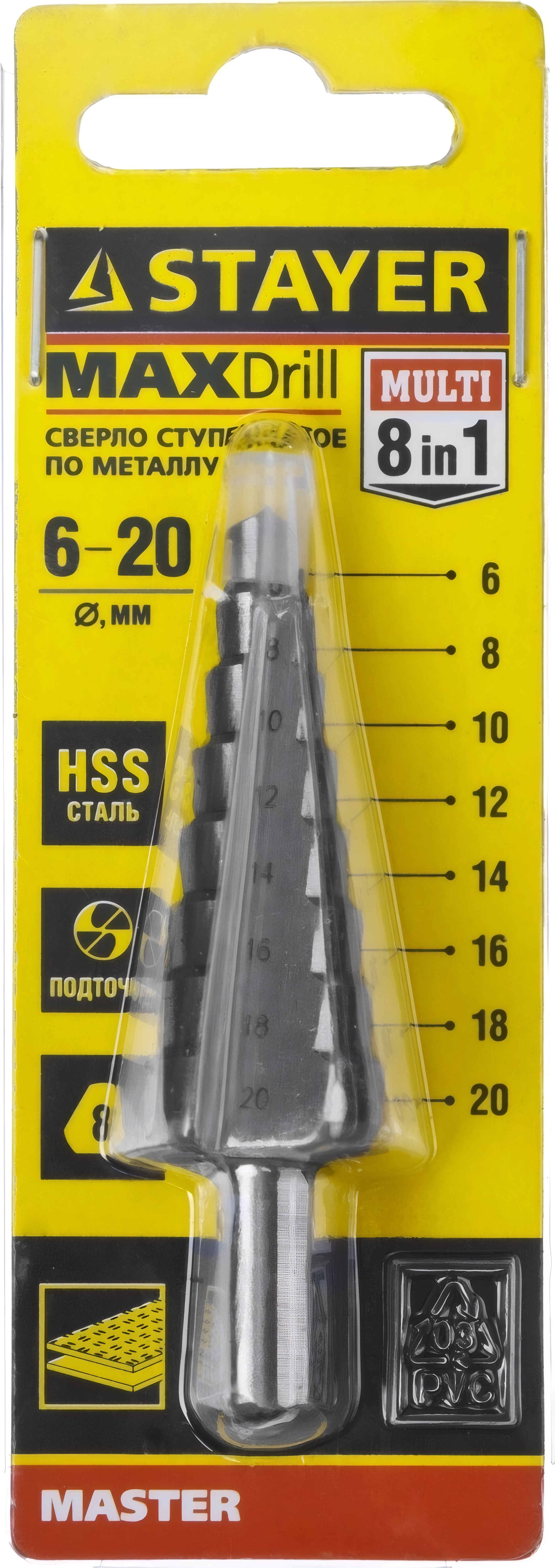 Ступенчатое сверло STAYER 6-20 мм, 8 ступеней, сталь HSS
