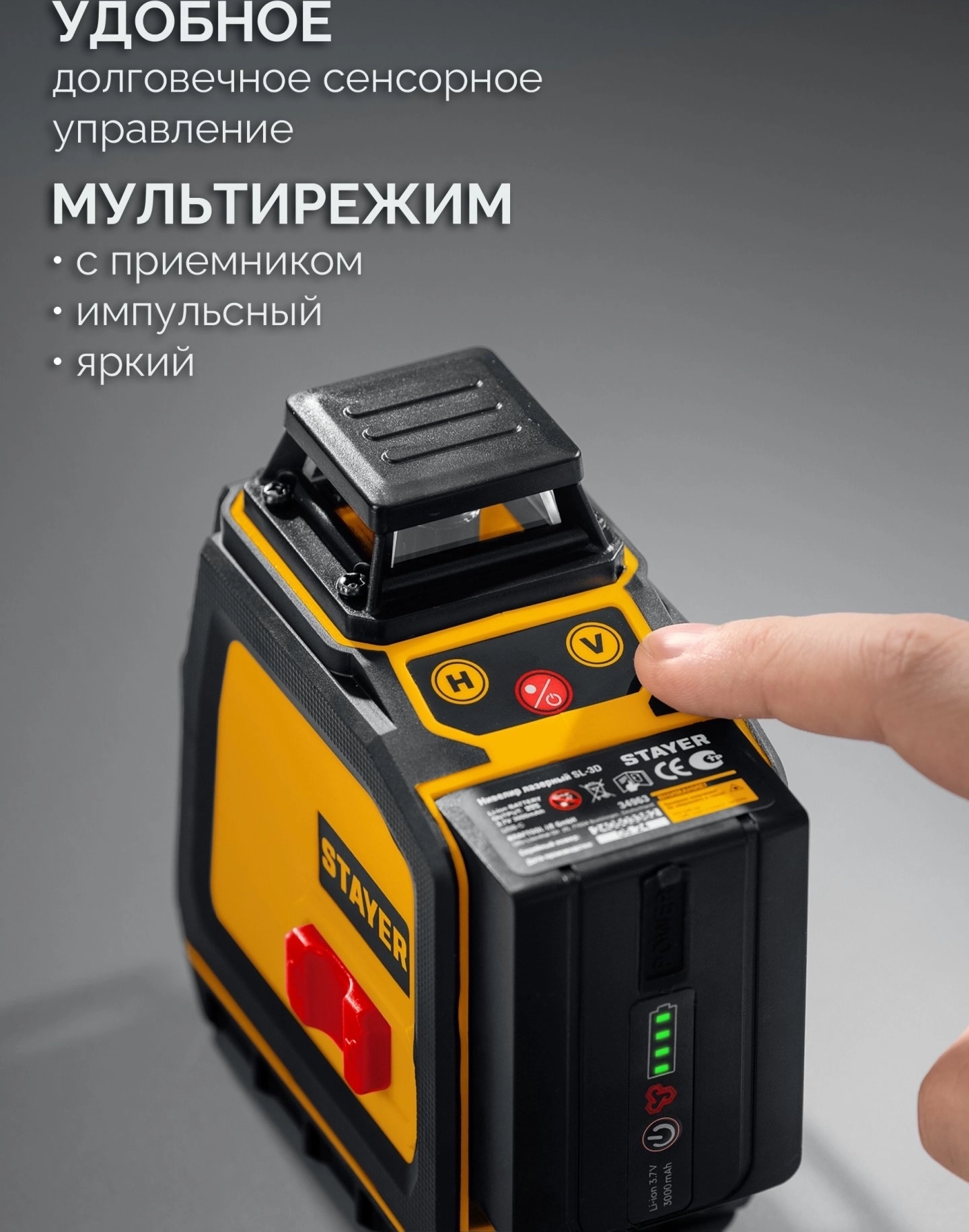 - 3 режима проецирования линий: горизонтальная и две вертикальные линии с развёрткой 360°, благодаря чему луч будет виден в любой точке.