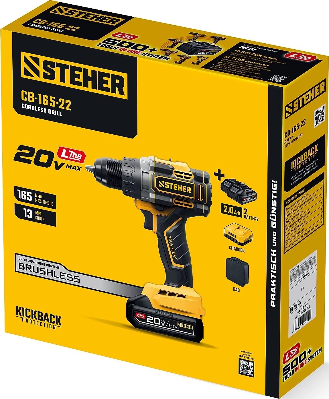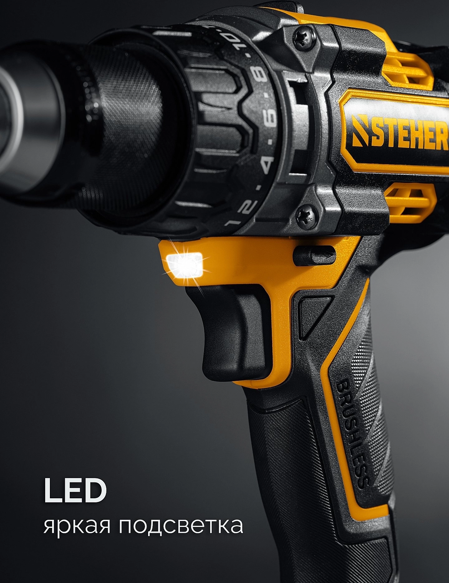 Бесщеточная дрель-шуруповерт STEHER 20 В, 165 Н·м, 2 АКБ LMS (2 А·ч)