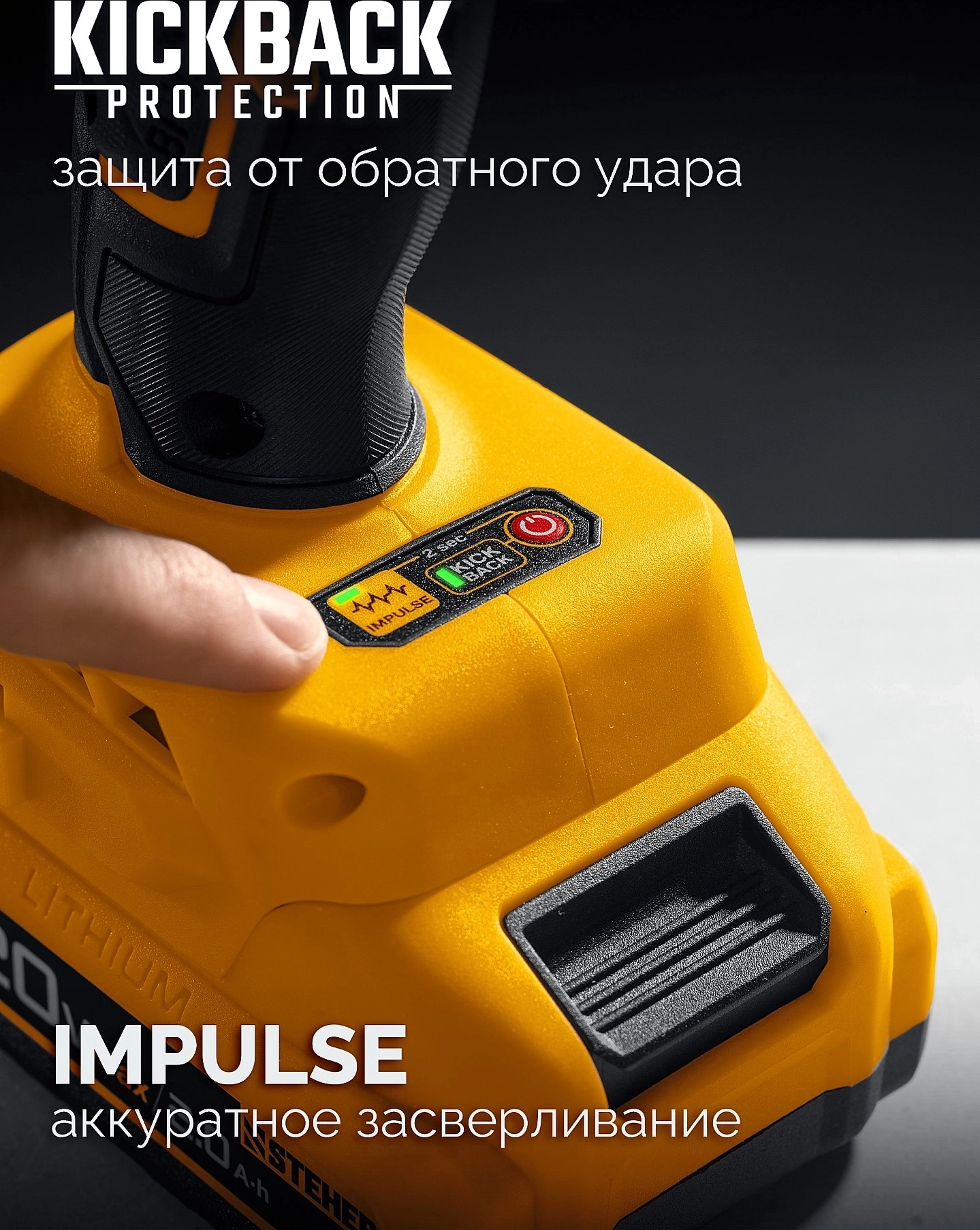 - Встроенная отключаемая защита от обратного удара контролирует рывки инструмента и выключает двигатель, предотвращая травмы оператора