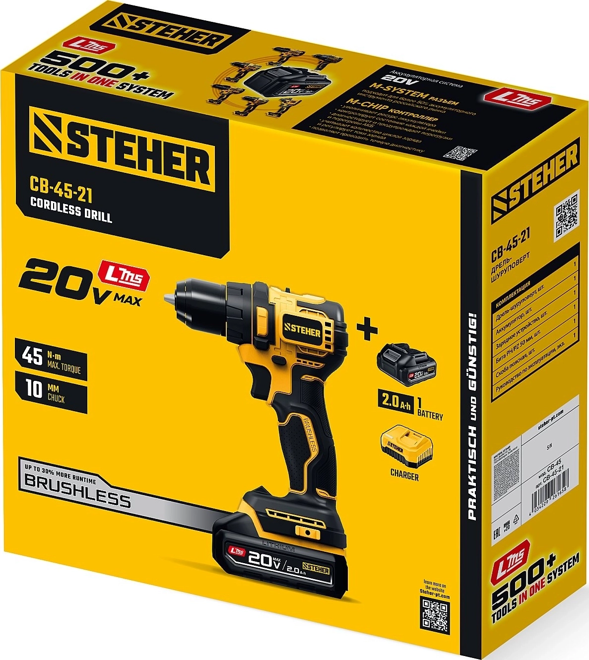 Бесщеточная дрель-шуруповерт STEHER 20 В, 45 Н·м, 1 АКБ LMS (2 А·ч)
