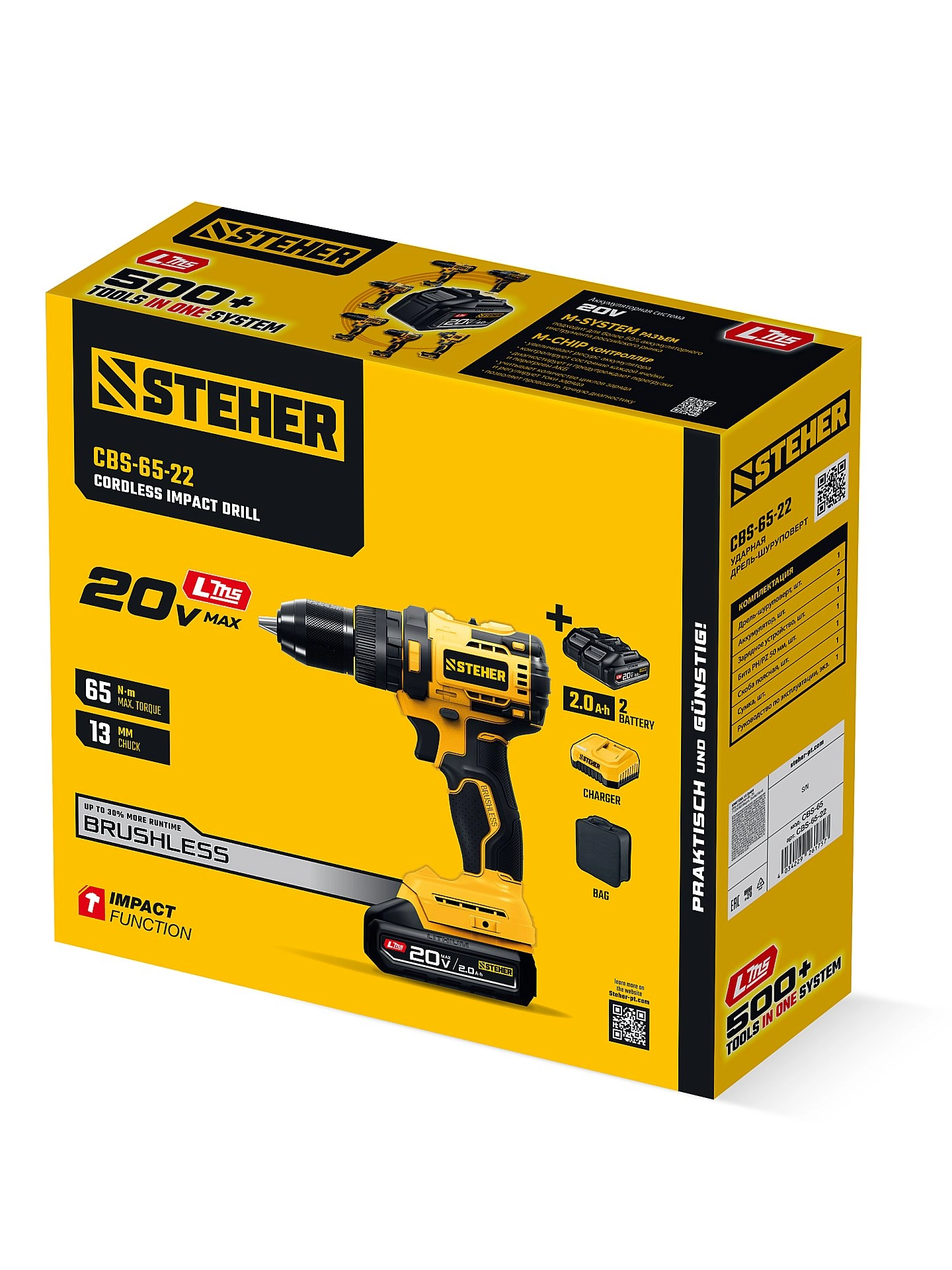 Сумка STEHER 20 В, 65 Н·м, 2 АКБ LMS (2 А·ч), бесщеточная ударная дрель-шуруповерт