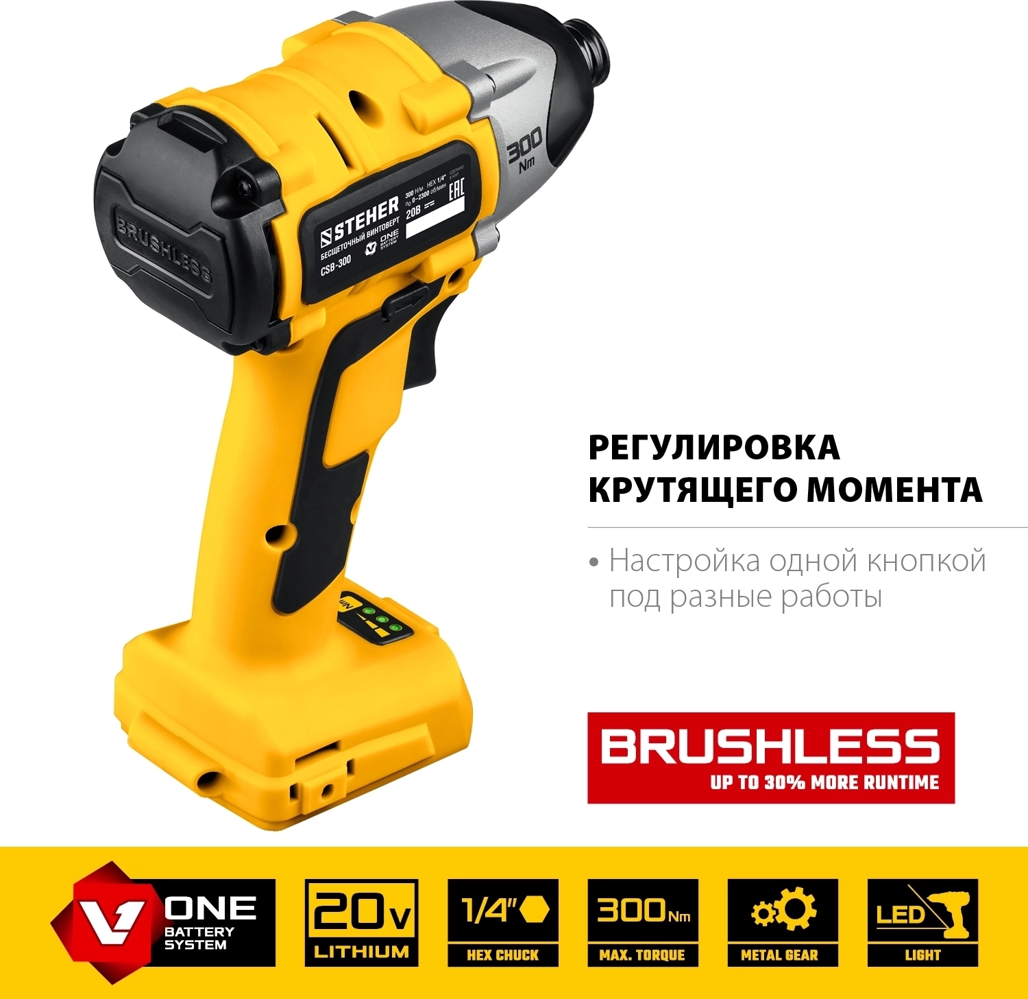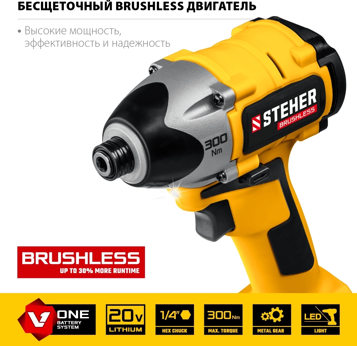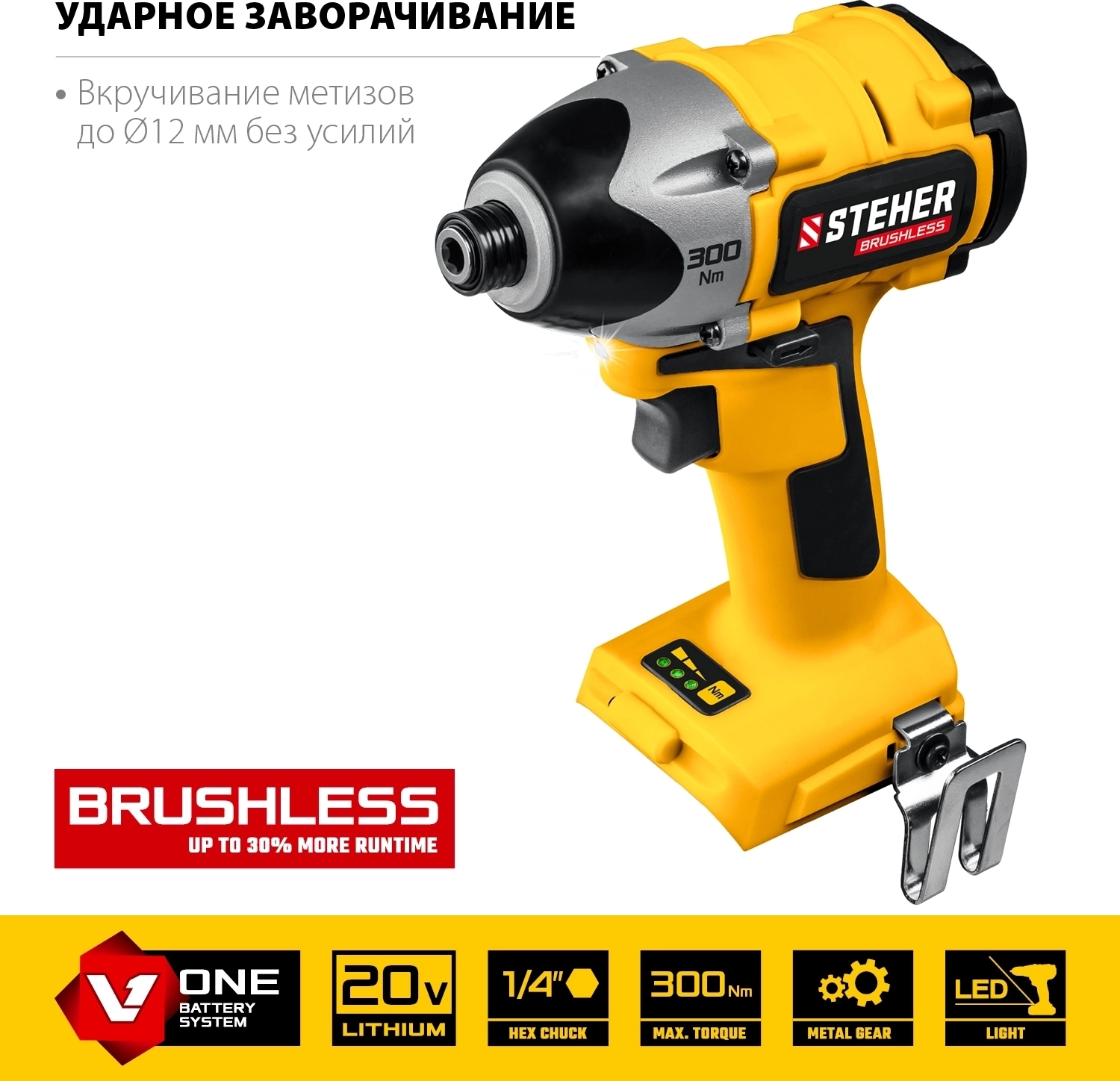 Бесщеточный винтоверт STEHER V1, 20 В, 300 Н·м, без АКБ