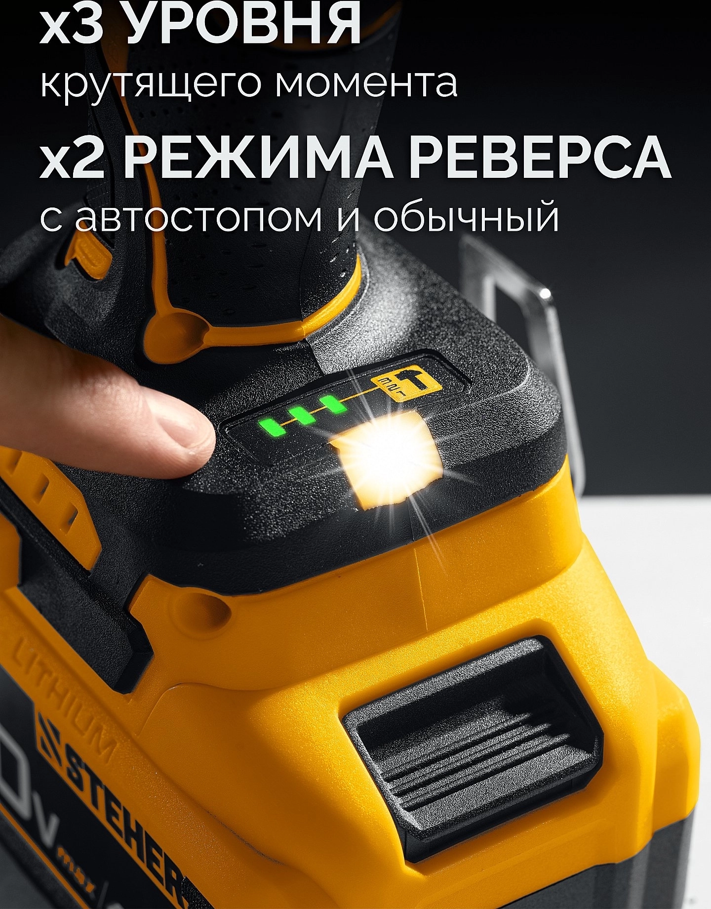 - Три уровня регулировки предоставляют возможность настроить крутящий момент под предстоящую работу или используемый крепеж