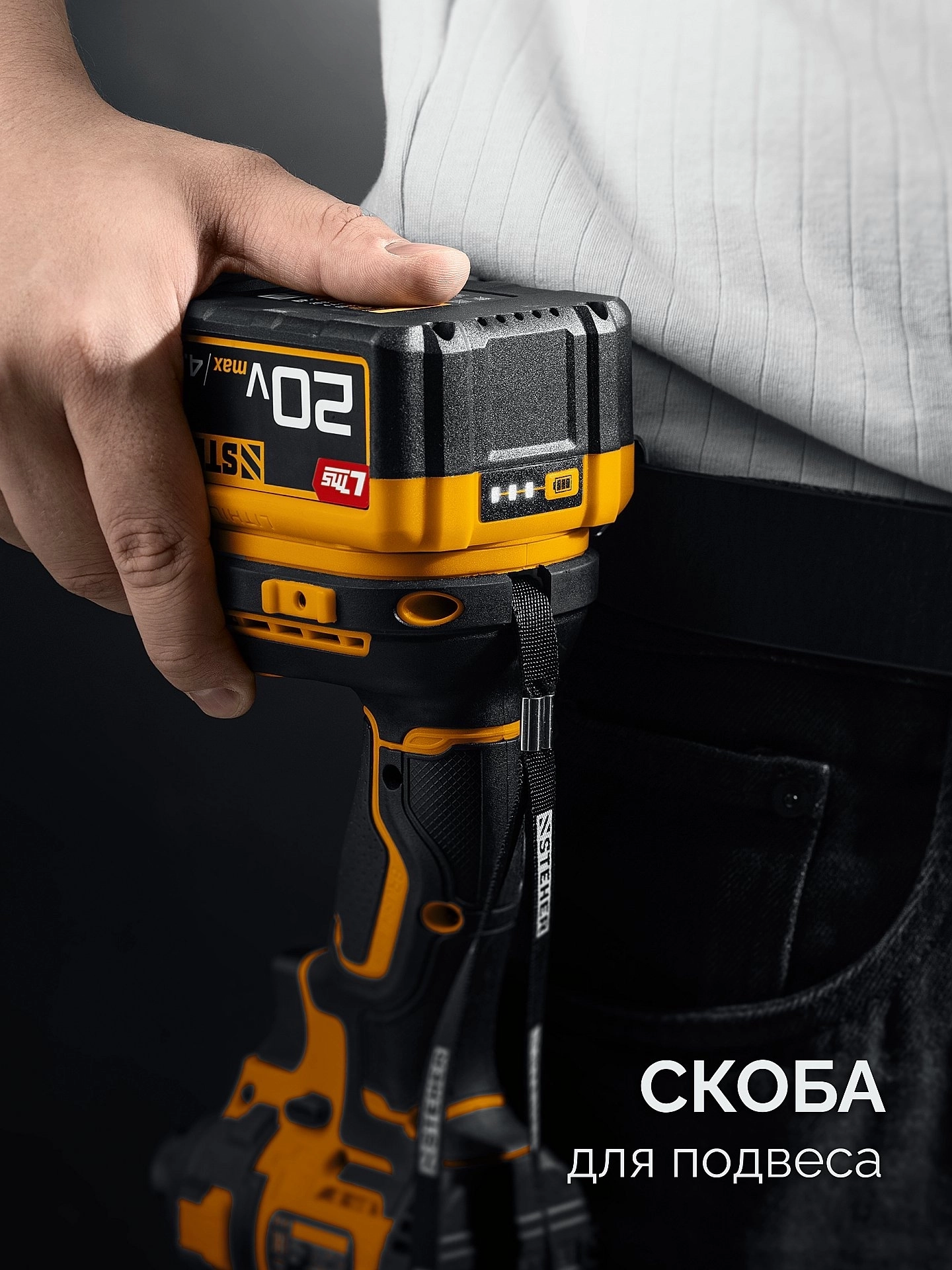 - Скоба для крепления на поясе, устанавливаемая с любой стороны инструмента
