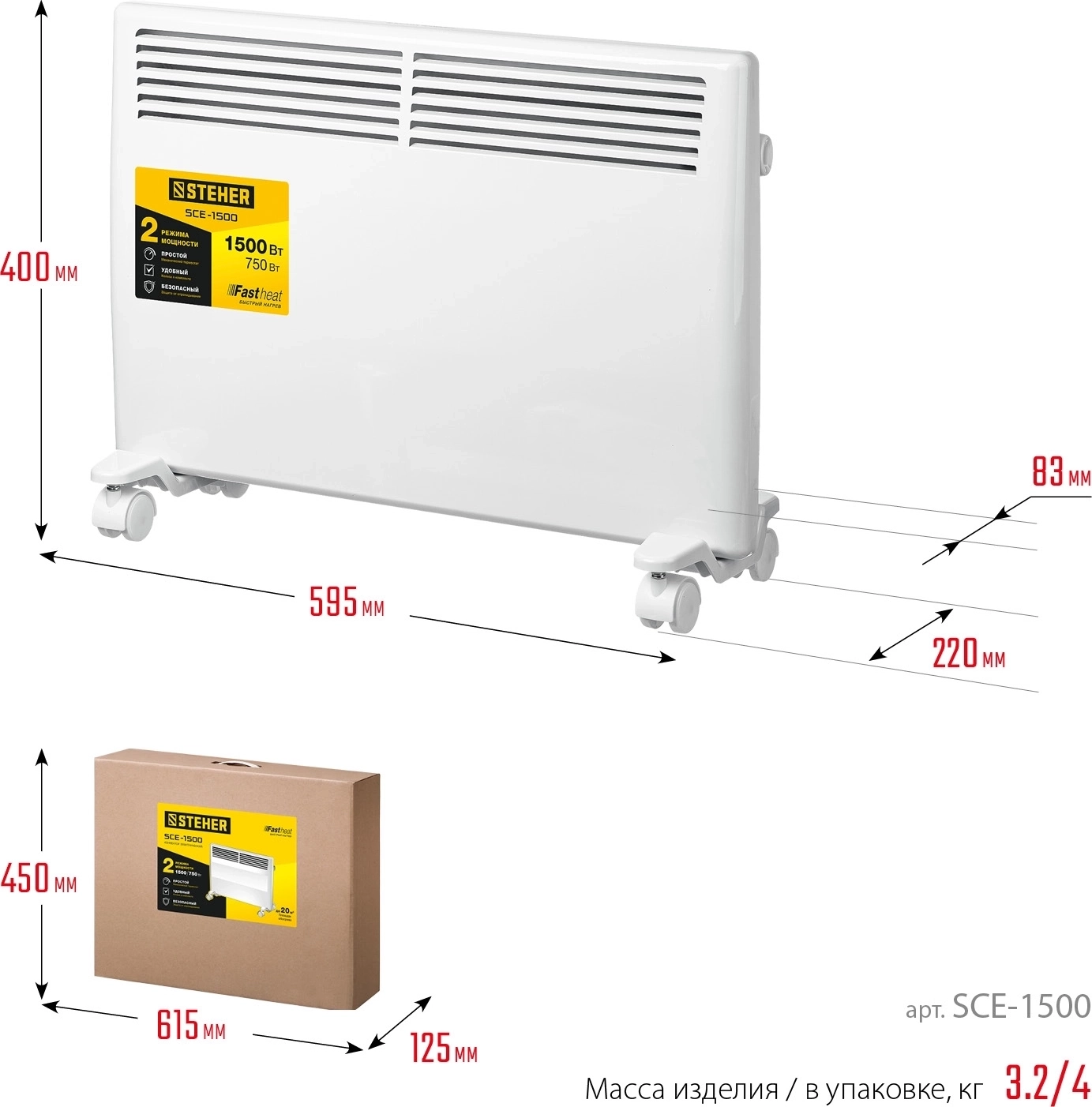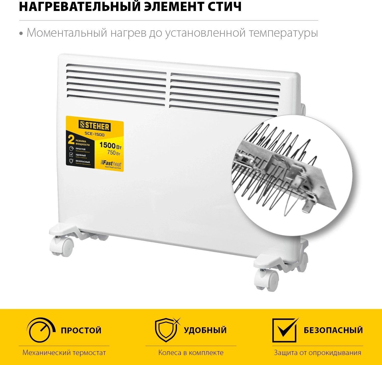 Электрический конвектор STEHER мощностью 1500 Вт - подойдет для обогрева любых домашних и офисных помещений площадью до 20 м2.