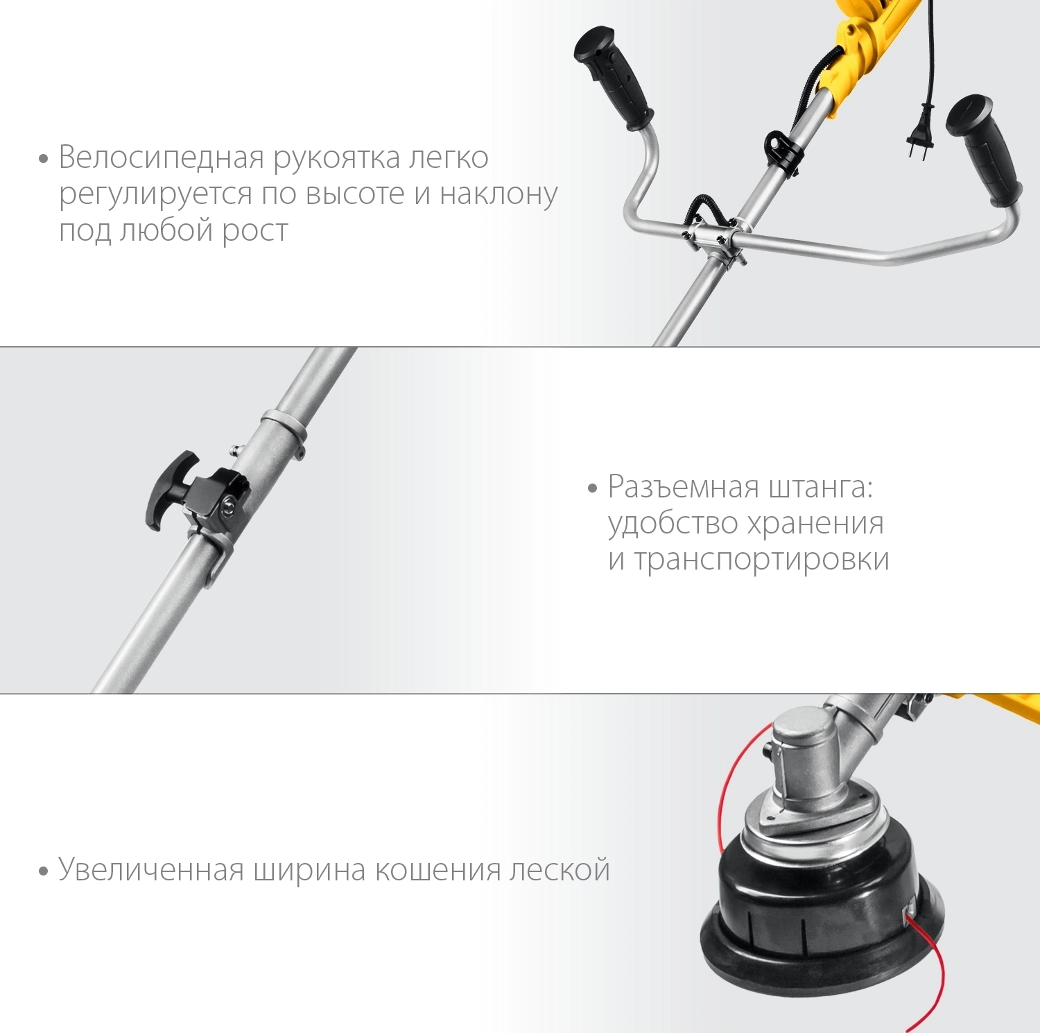 - Возможность установки двух видов режущего инструмента - лески и ножа - делают изделие универсальным