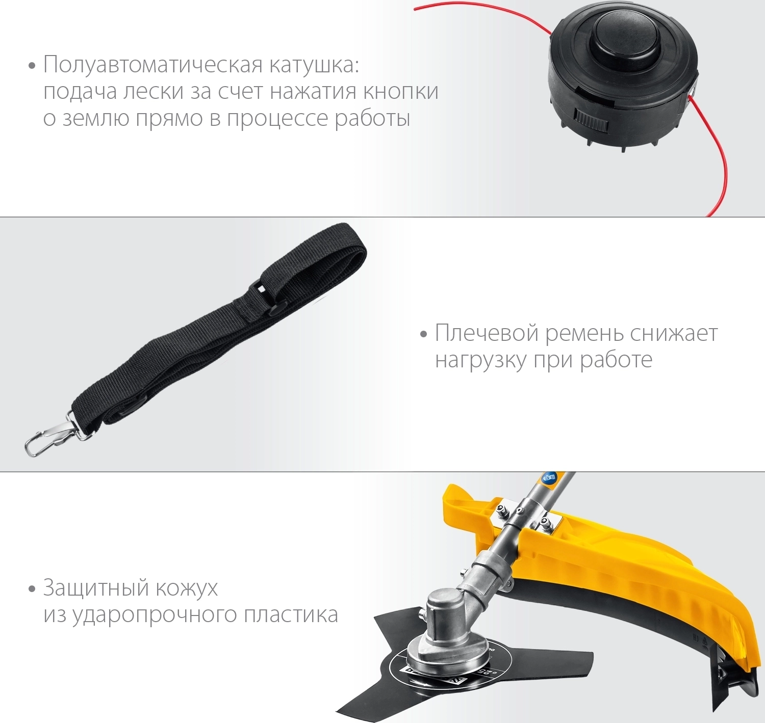 - Возможность установки двух видов режущего инструмента - лески и ножа - делают изделие универсальным