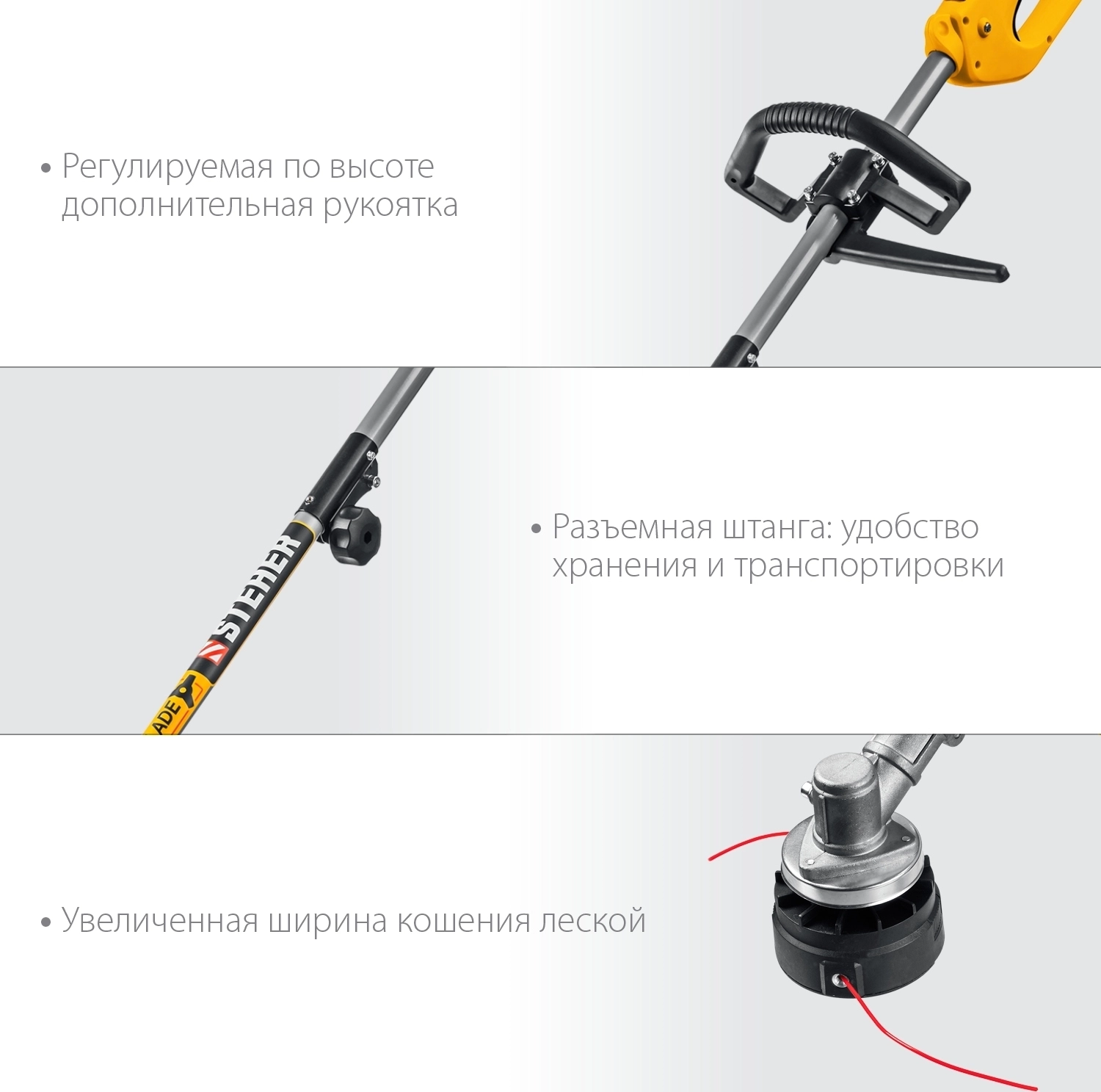 - Идеальная развесовка (благодаря верхнему расположению двигателя) и плечевой ремень увеличивают маневренность и облегчают эксплуатацию
