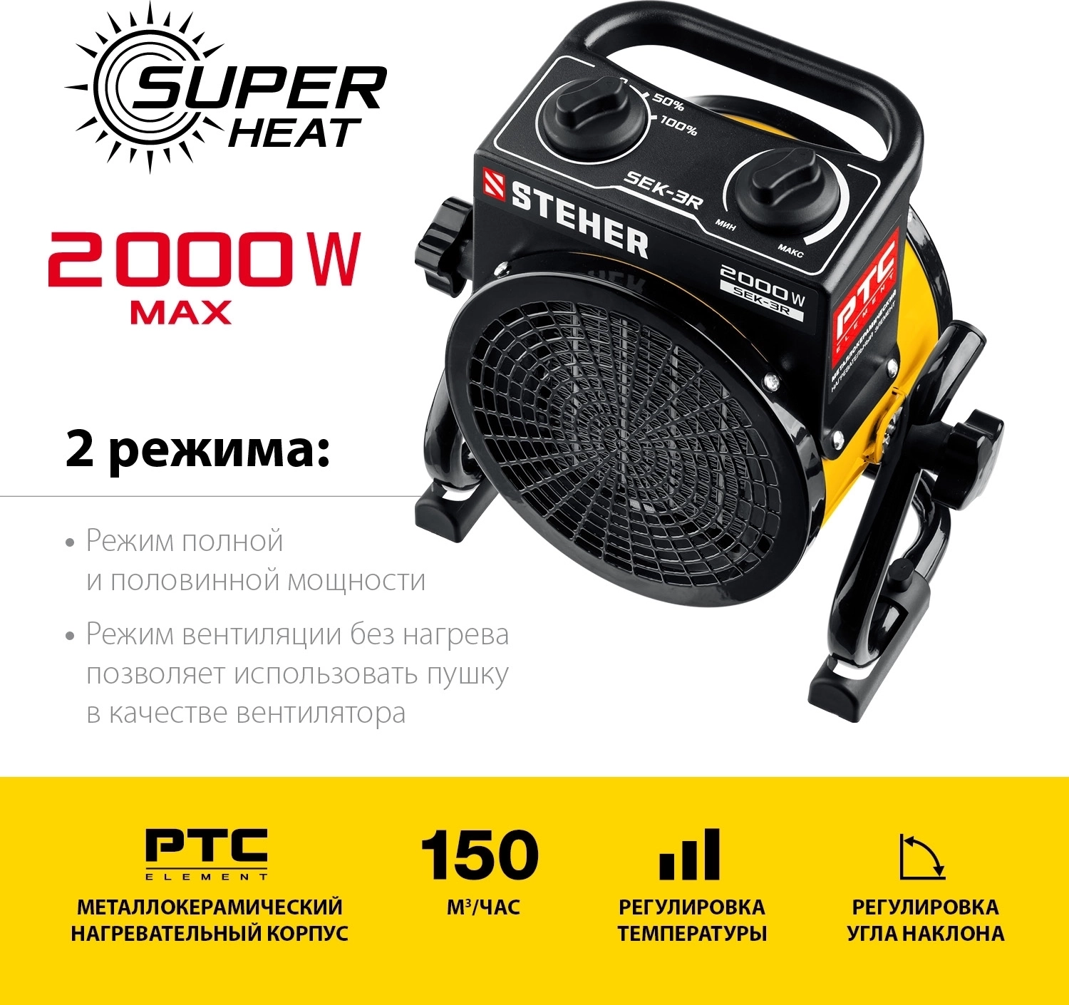 Электрические тепловые пушки STEHER серии SEK – компактные пушки в круглом корпусе для обогрева небольших помещений. Благодаря небольшим размерам тепловую пушку легко переносить и хранить. Устройства оснащены долговечным металлокерамическим нагревательный элементом,обеспечивающий быстрый равномерный нагрев, экономное потребление электроэнеергии и не сушит воздух. Механический терморегулятор поддерживает нужную температуру нагрева.За счет большой площади теплообмена и небольшой температуры нагрева элемента, воздух быстро прогревается. Изделие можно оставлять на долгое время и не бояться за сохранность помещения, так как конструктивные меры безопасности защищают Вас и изделие при нештатных ситуациях.