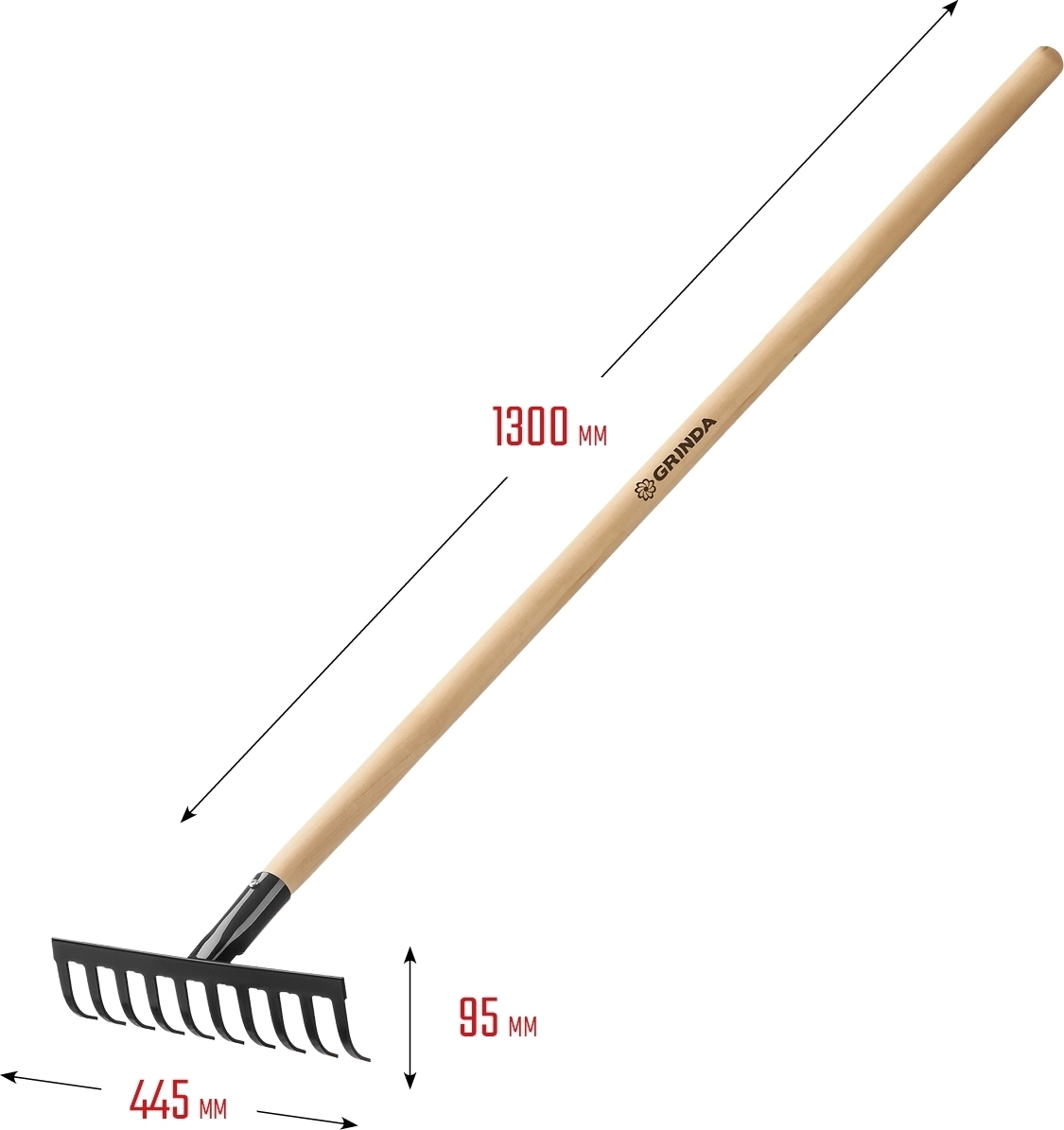 Садовые грабли GRINDA GT-10 WOOD, 260 х 80 х 1300 мм, 10 прямых зубцов, углерод. сталь, антикор. покрытие, черенок дерев. высш. сорт