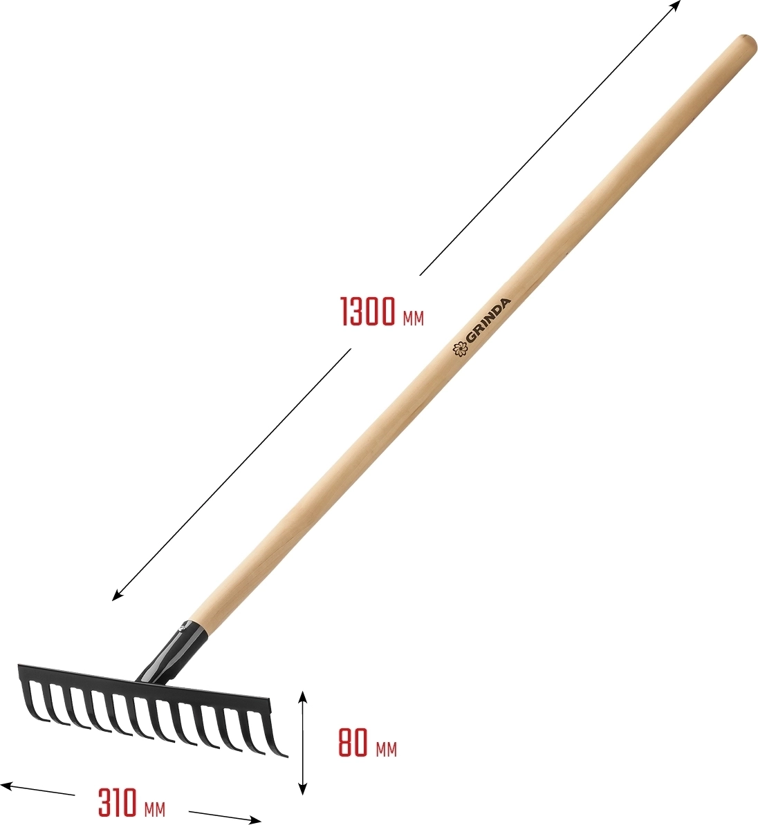 Садовые грабли GRINDA GT-12 WOOD, 310 х 80 х 1300 мм, 12 прямых зубцов, углерод. сталь, антикор. покрытие, черенок дерев. высш. сорт