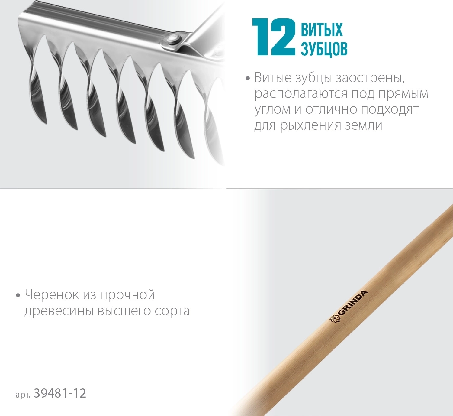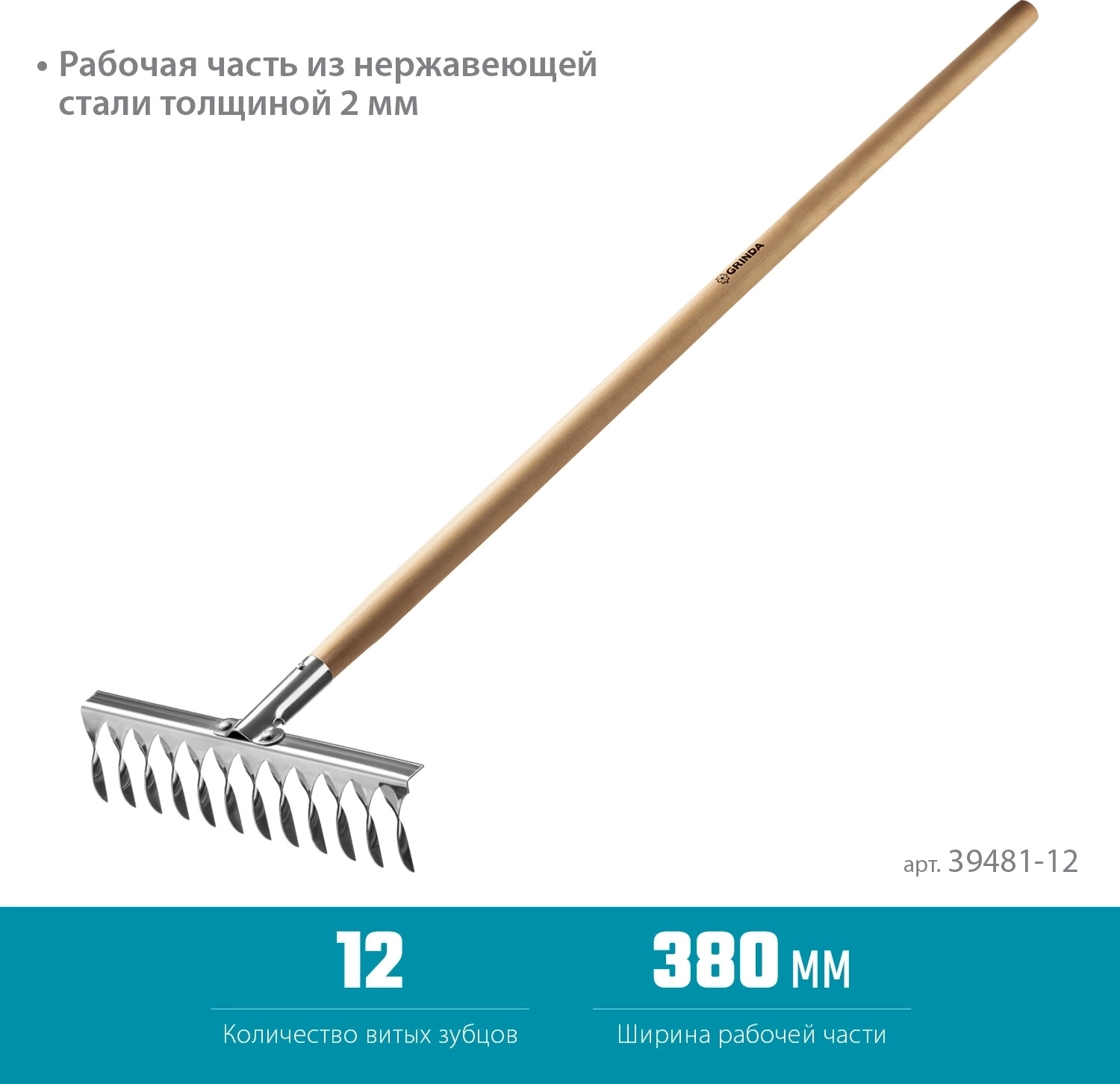 Садовые грабли PROLine GRINDA PS-12 WOOD 370 х 105 х 1300 мм 12 витых зубцов нержавеющая сталь деревянный черенок