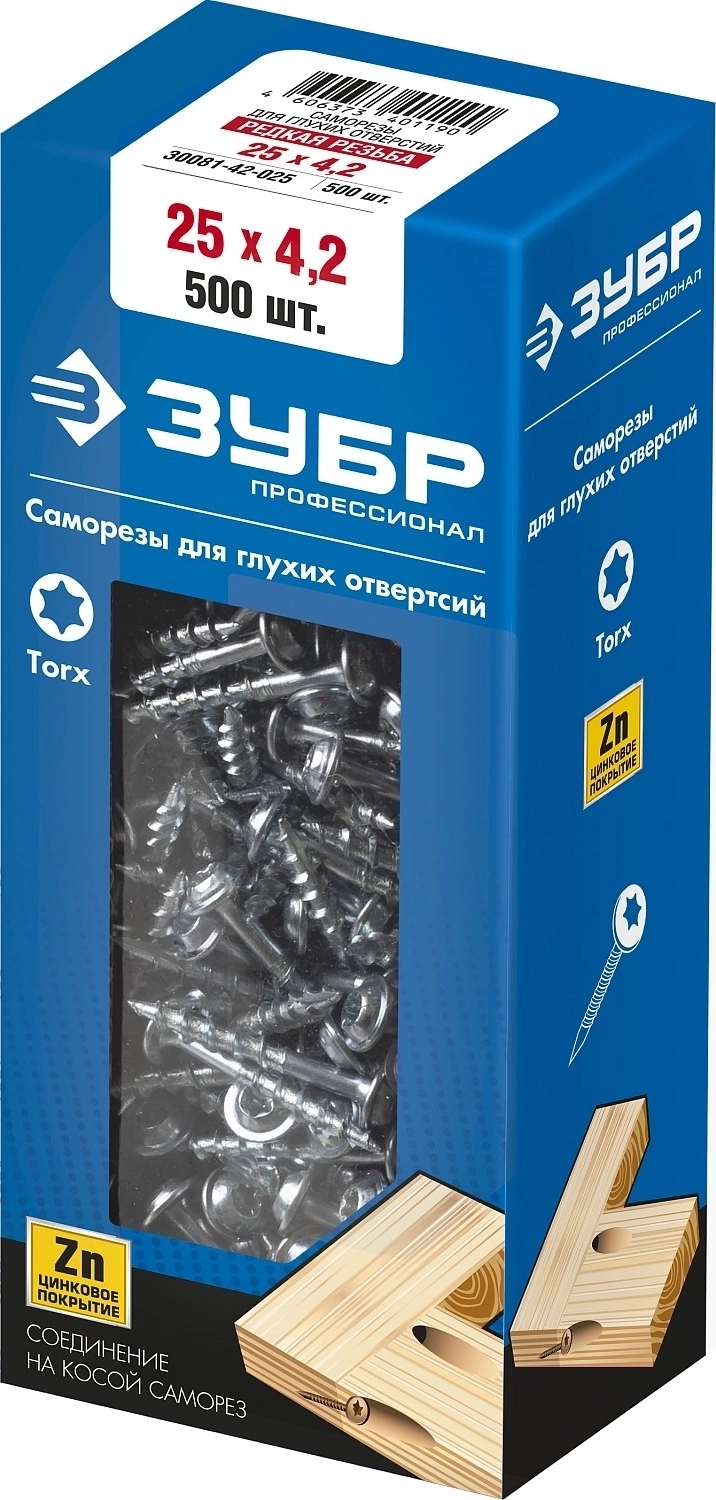 Саморез для глухих отверстий ЗУБР 25 х 4.2 мм редкая резьба ТХ20 цинк 500 шт