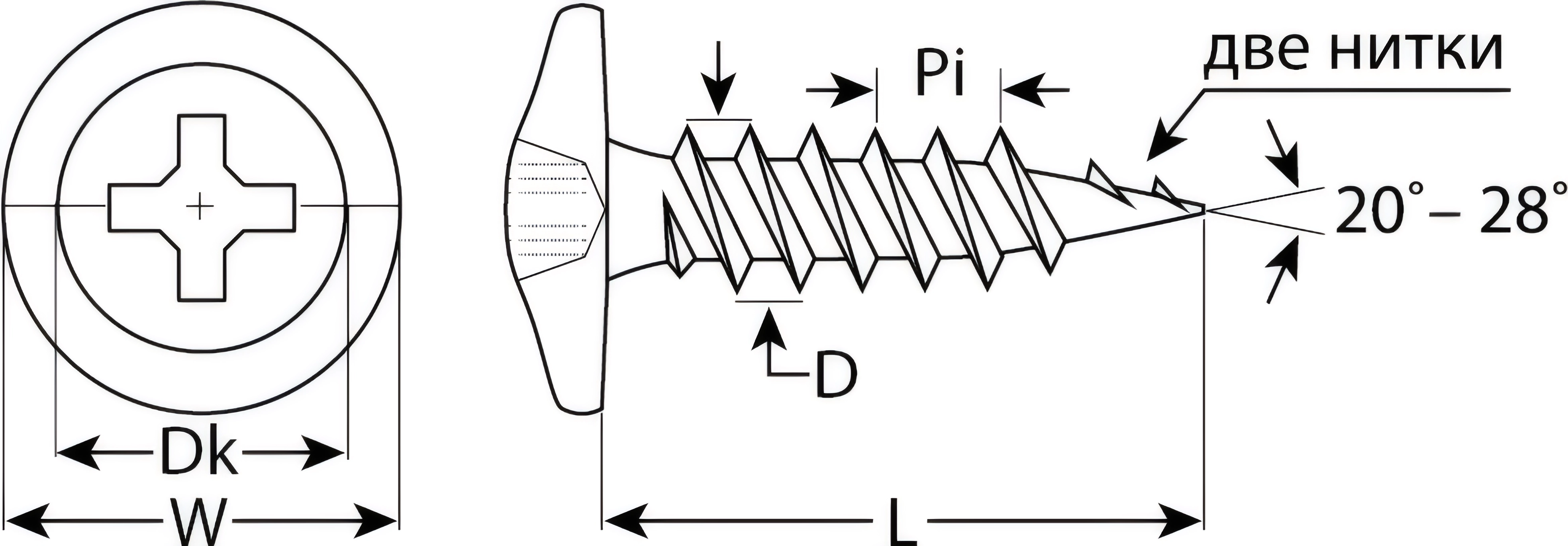 Саморезы с пресс-шайбой для листового металла изготовлены из стального прутка с высоким содержанием углерода. Контроль за геометрией самореза начинается с калибровки прутка и заканчивается тщательной проверкой размеров готового изделия. Нормативная твердость стали достигается термической обработкой. Поверхностная твердость 550-720HV, твердость в сердцевине 240-450HV. Саморезы легко вкручиваются обычным шуруповертом или отверткой с крестообразным шлицем PH2 (DIN). Предварительное сверление в скрепляемых материалах не требуется. Геометрические размеры: диаметр пресс-шайбы (W) - 10.5-11.0мм, диаметр головки (Dk) - 6.5-7.0мм, диаметр резьбы (D) - 4.1-4.3мм, шаг резьбы (Pi) - 3.38мм.