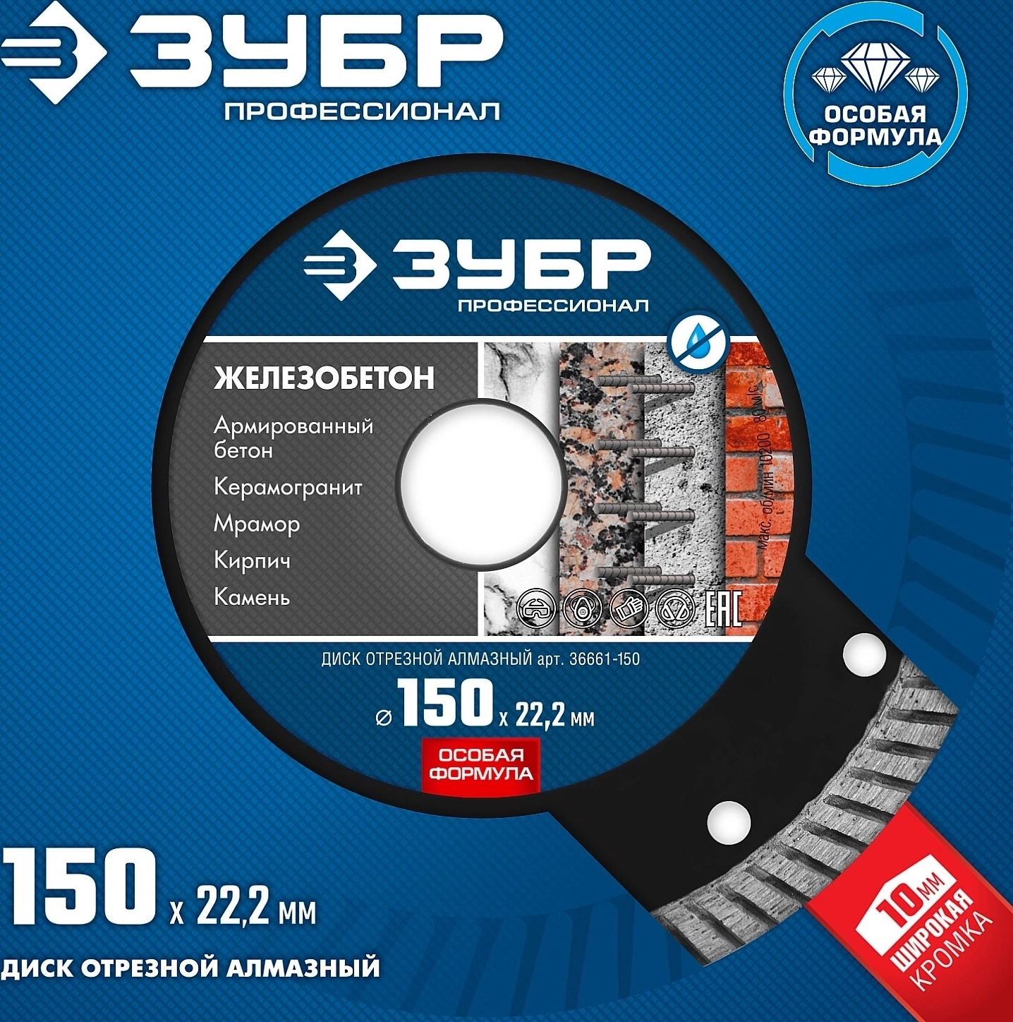 Сегментированный алмазный диск ЗУБР Железобетон 150 мм 22.2 мм 10 х 2.4 мм