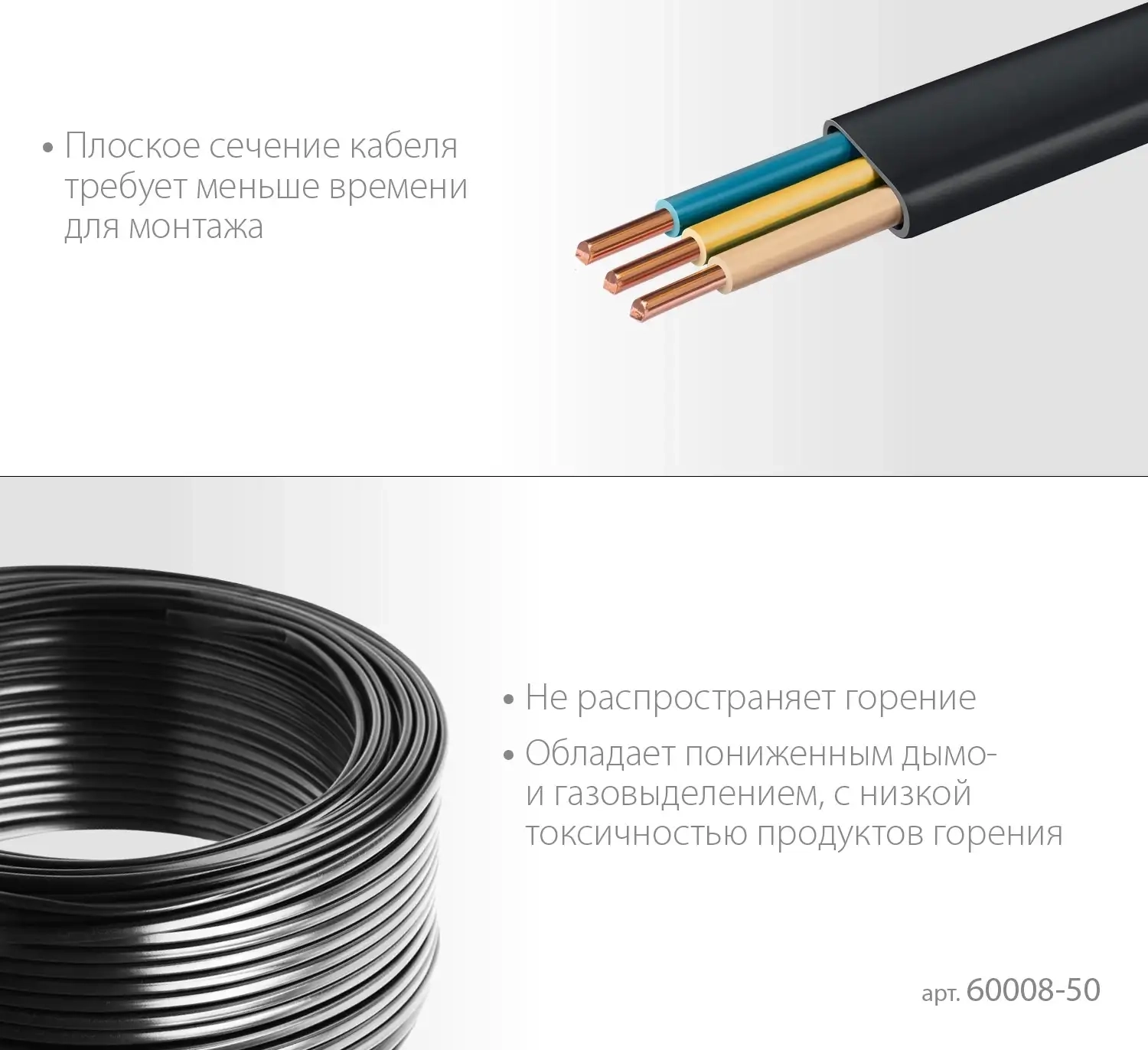 - Плоское сечение кабеля требует меньше времени для монтажа