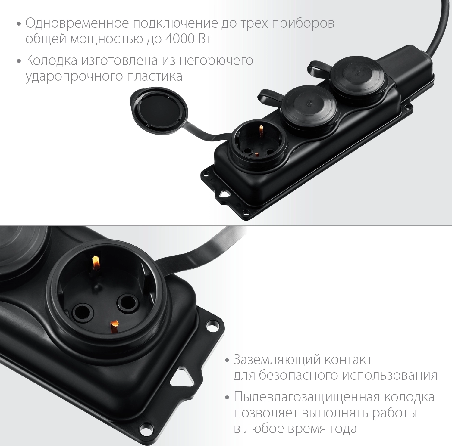 Удлинитель предназначен для подключения электрических приборов, которые находится на удалении от основного источника сети. Провод КГ (резиновая изоляция) устойчив к низким температурам до -40°С, к агрессивным средам, к деформациям и ударам. Позволяет выполнять работы в любое время года.