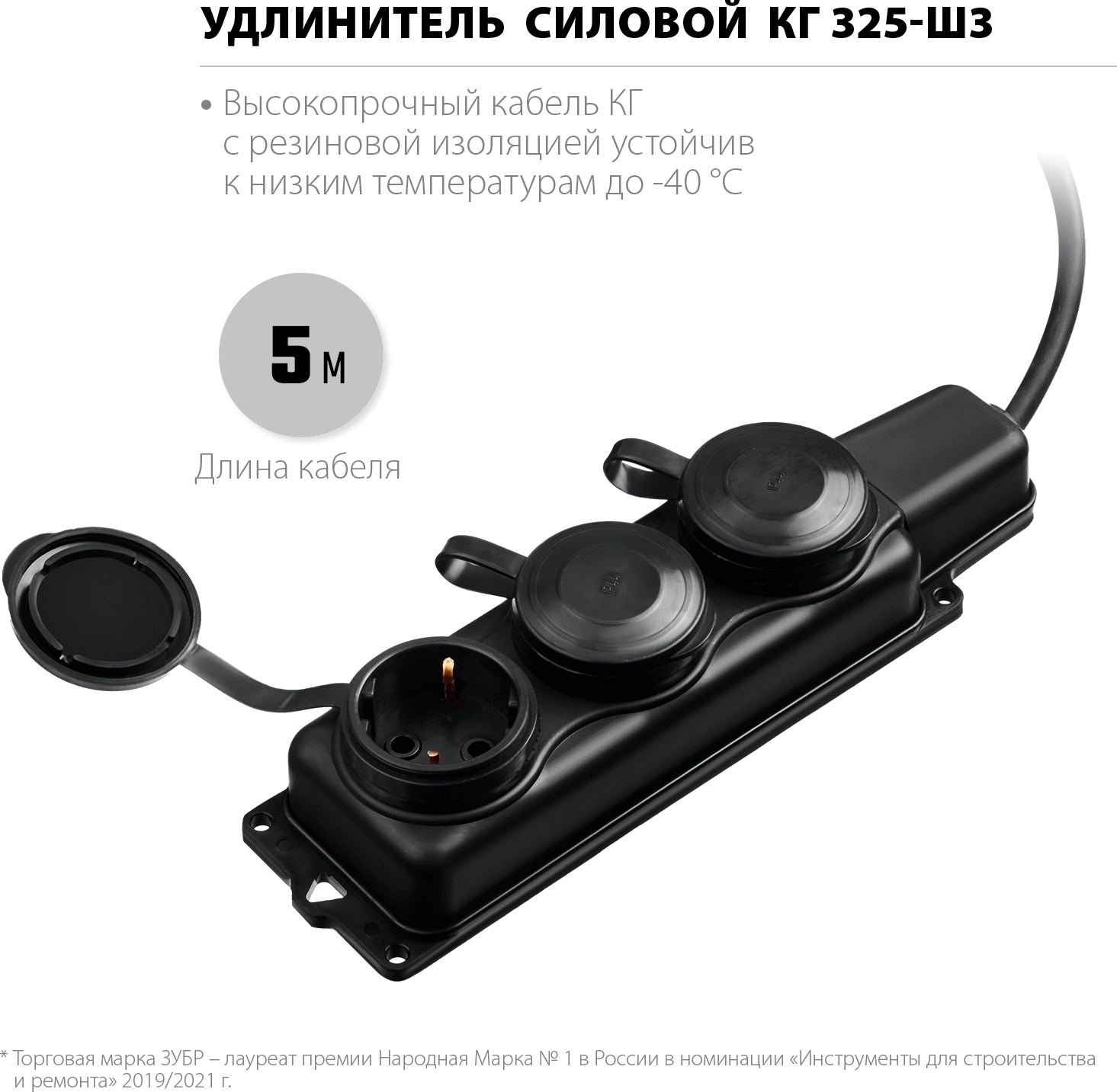 Силовой удлинитель ЗУБР КГ-325-Ш3 КГ 3 x 2.5 мм2 IP44 5 м 3 гн. 4000 Вт