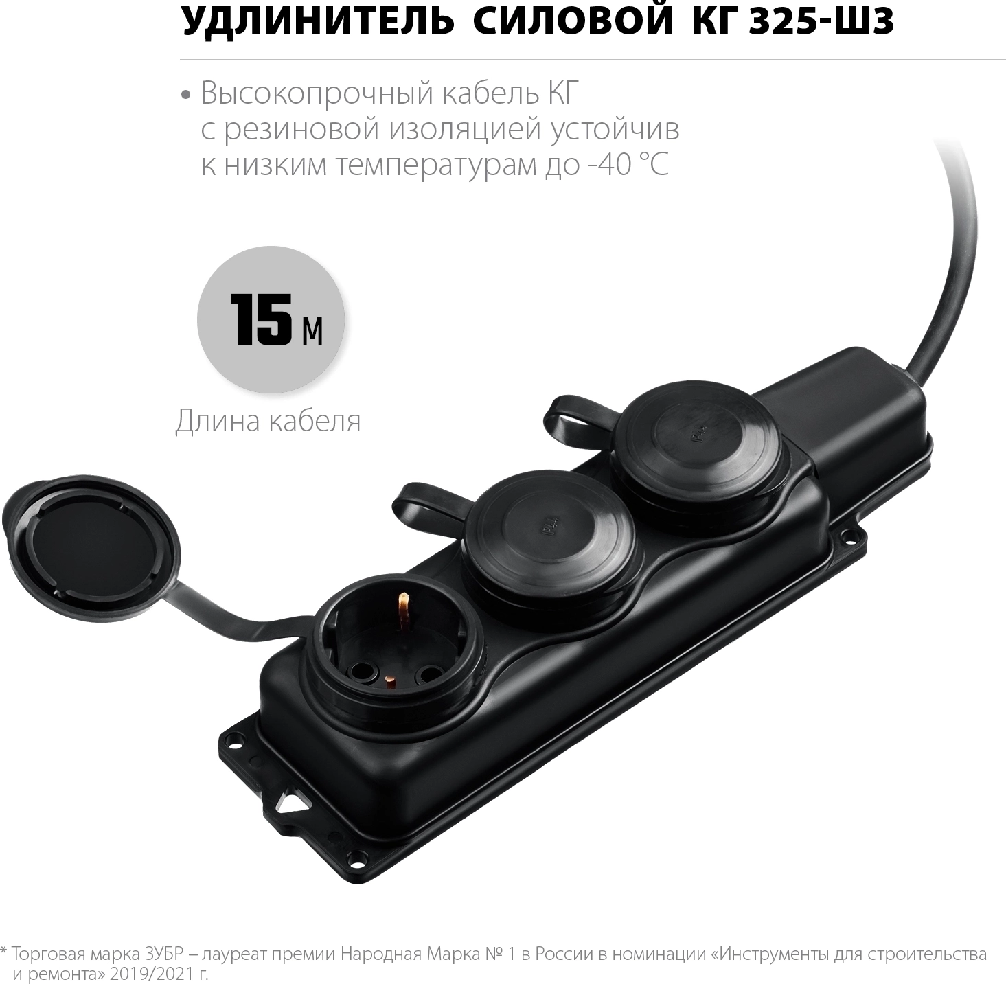 Силовой удлинитель ЗУБР КГ-325-Ш3 КГ 3 x 2.5 мм2 IP44 15 м 3 гн. 4000 Вт