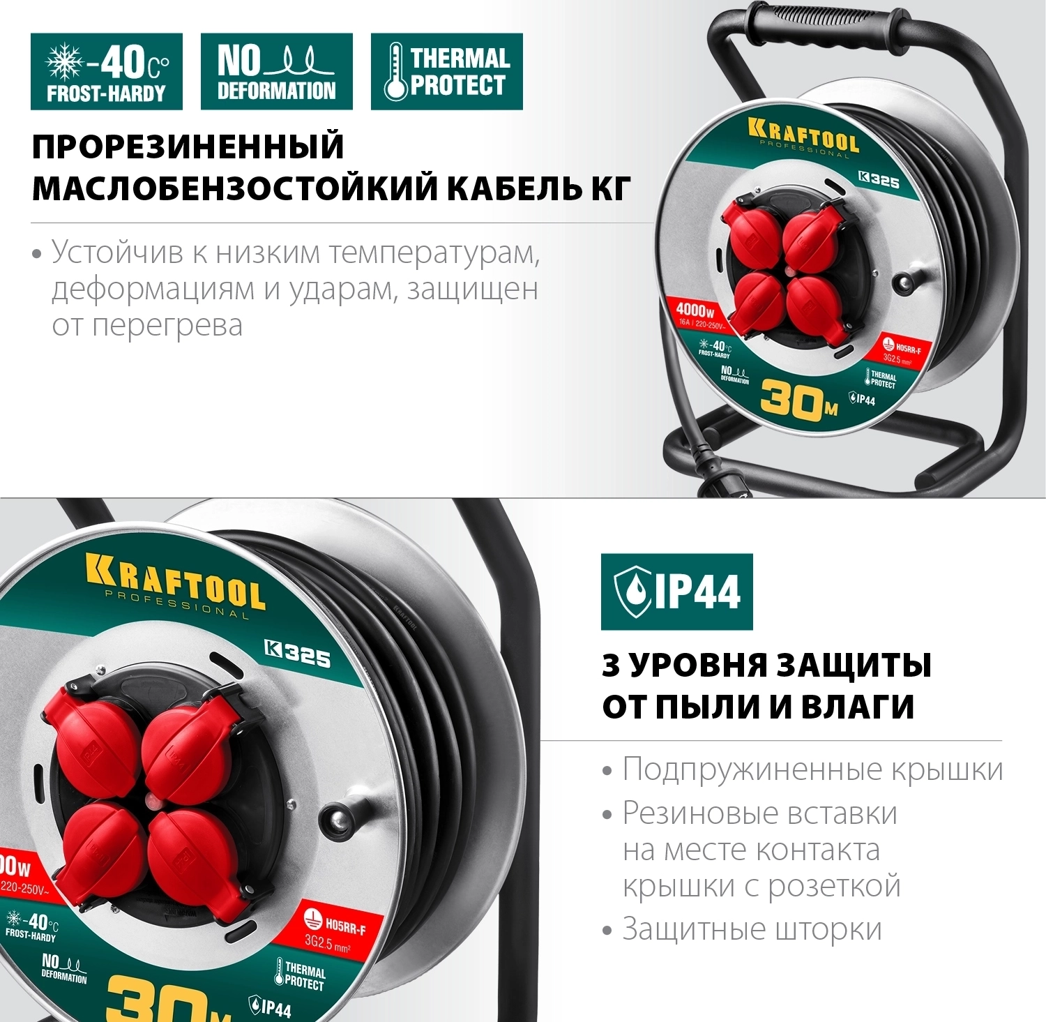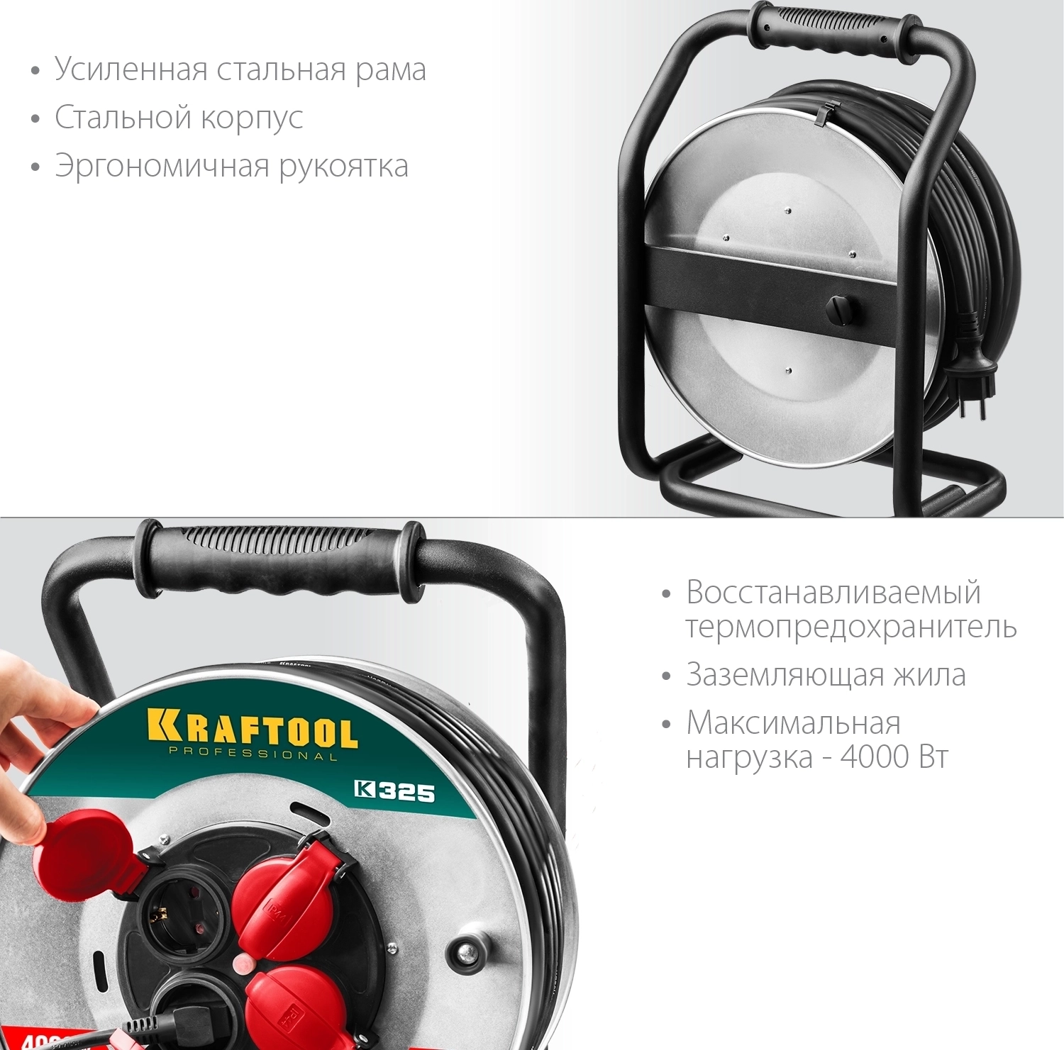 Силовой удлинитель на стальной катушке KRAFTOOL K-325, КГ, 3 х 2.5 мм2, 30 м, 4000 Вт, IP44