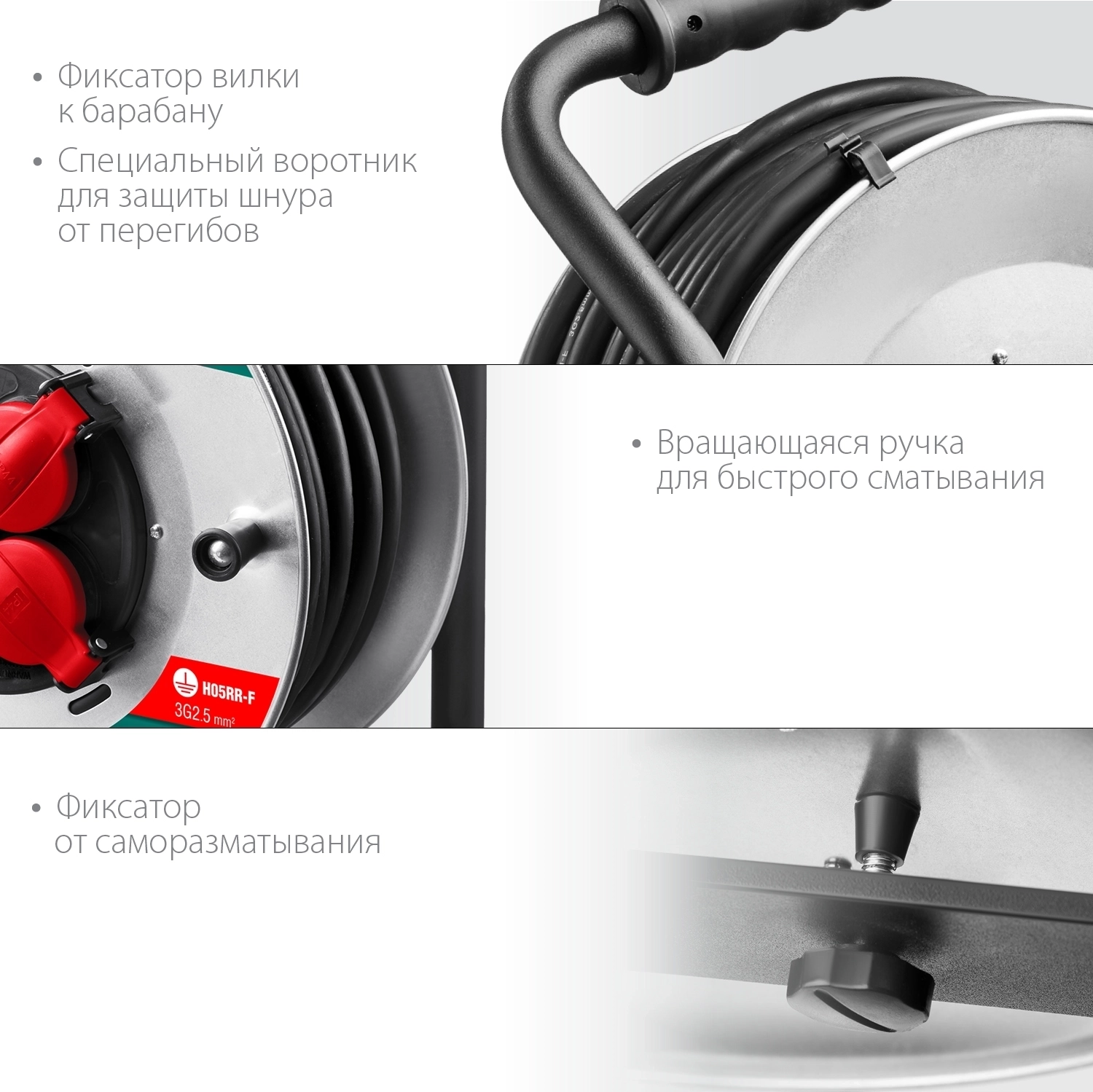 - Катушка позволяет легко сматывать и разматывать кабель, обеспечивая мобильное перемещение и компактное хранение.