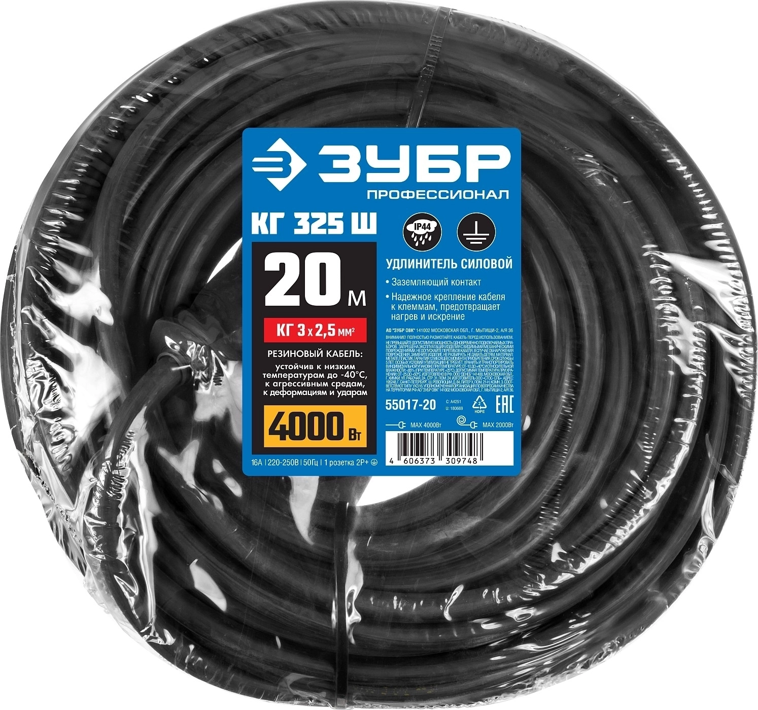 Силовой удлинитель-шнур ЗУБР КГ-325-Ш КГ 3 х 2.5 мм2 20 м IP44 4000 Вт