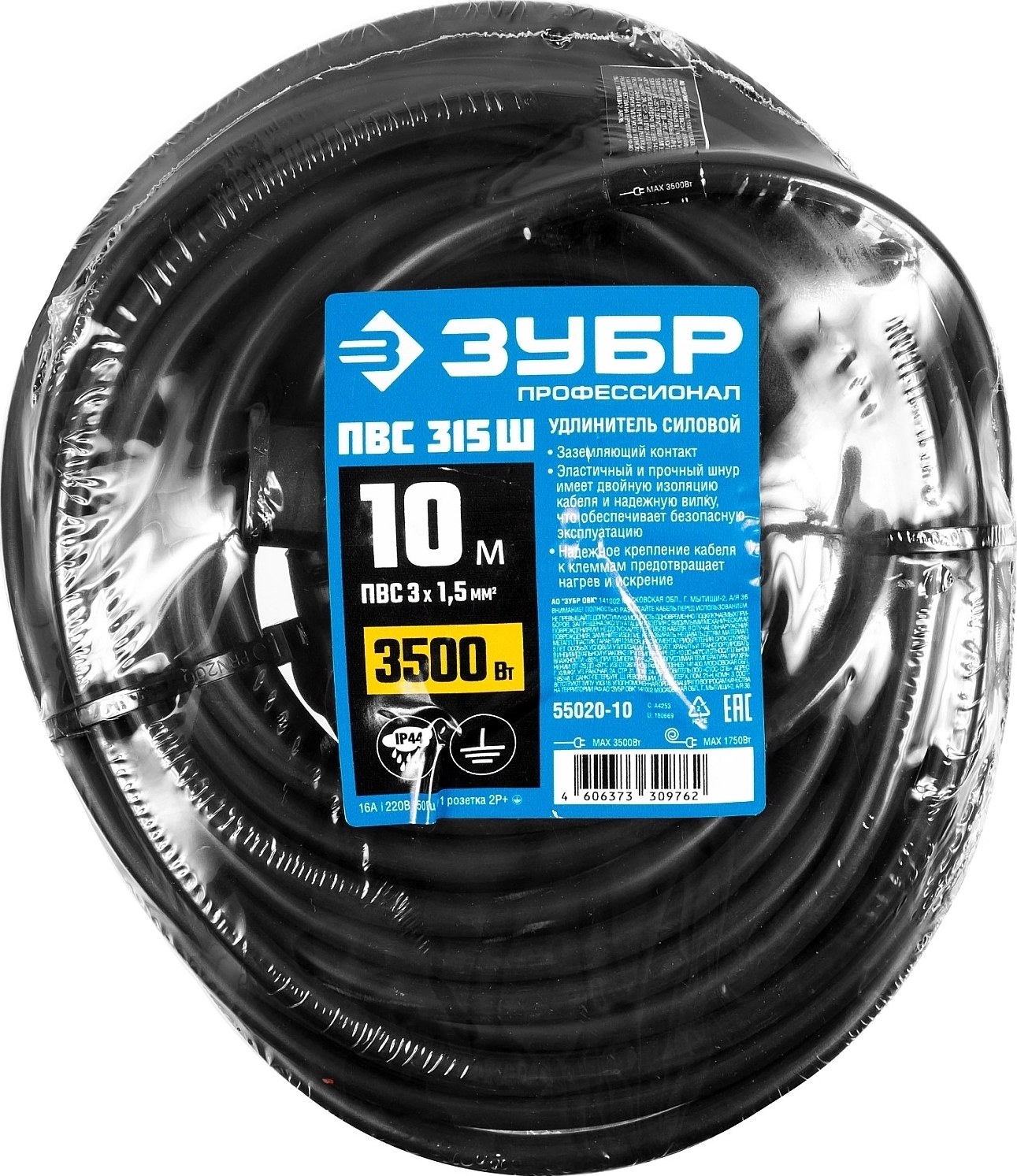 Силовой удлинитель-шнур ЗУБР ПВС-315-Ш ПВС 3 х 1.5 мм2 10 м IP44 3500 Вт
