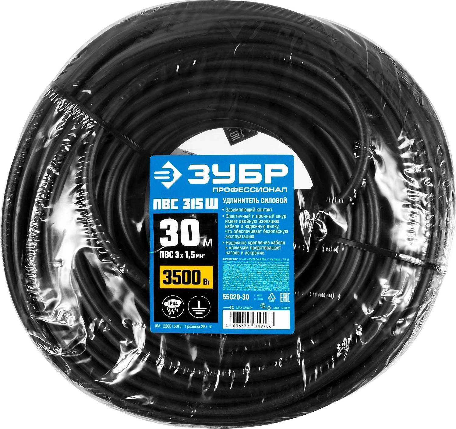 Силовой удлинитель-шнур ЗУБР ПВС-315-Ш ПВС 3 х 1.5 мм2 30 м IP44 3500 Вт