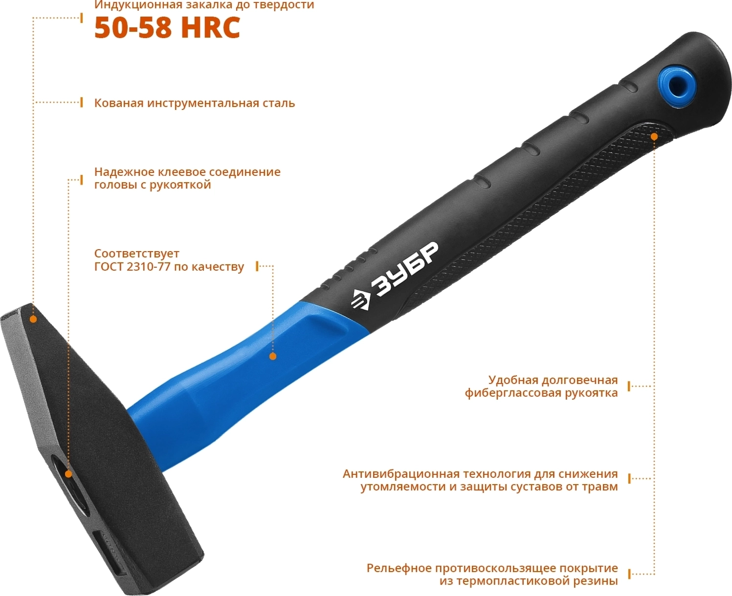 Молоток ЗУБР ПРОФЕССИОНАЛ оснащен особопрочной фибергласовой рукояткой. АВТ - технология позволяет существенно снизить вибрации, возникающие во время удара, что делает работу с инструментом более комфортной. Соответствует требованиям ГОСТ 2310-77.