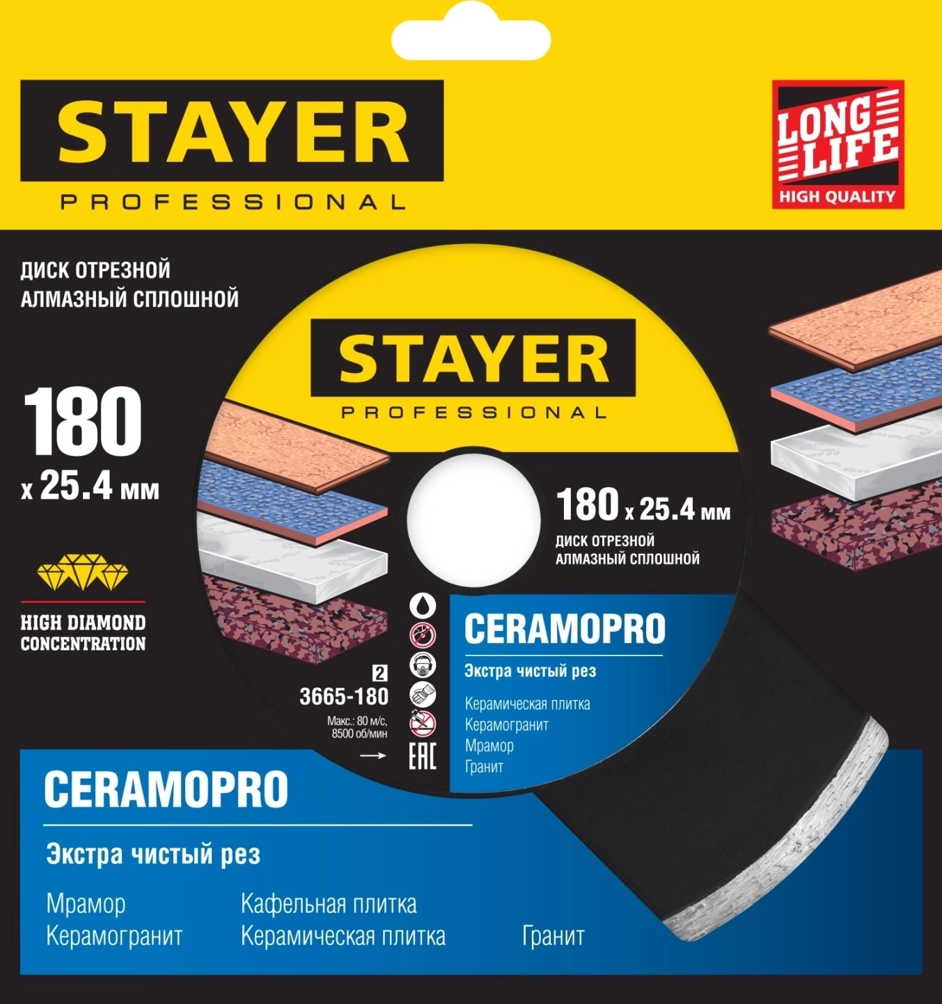 Неоспоримым преимуществом отрезных алмазных дисков STAYER серии PROFESSIONAL является их высокая производительность, увеличенный рабочий ресурс и универсальность применения при обработке различных строительных материалов. Резка керамической плитки, керамогранита, мрамора и других строительных материалов при обязательном водяном охлаждении.