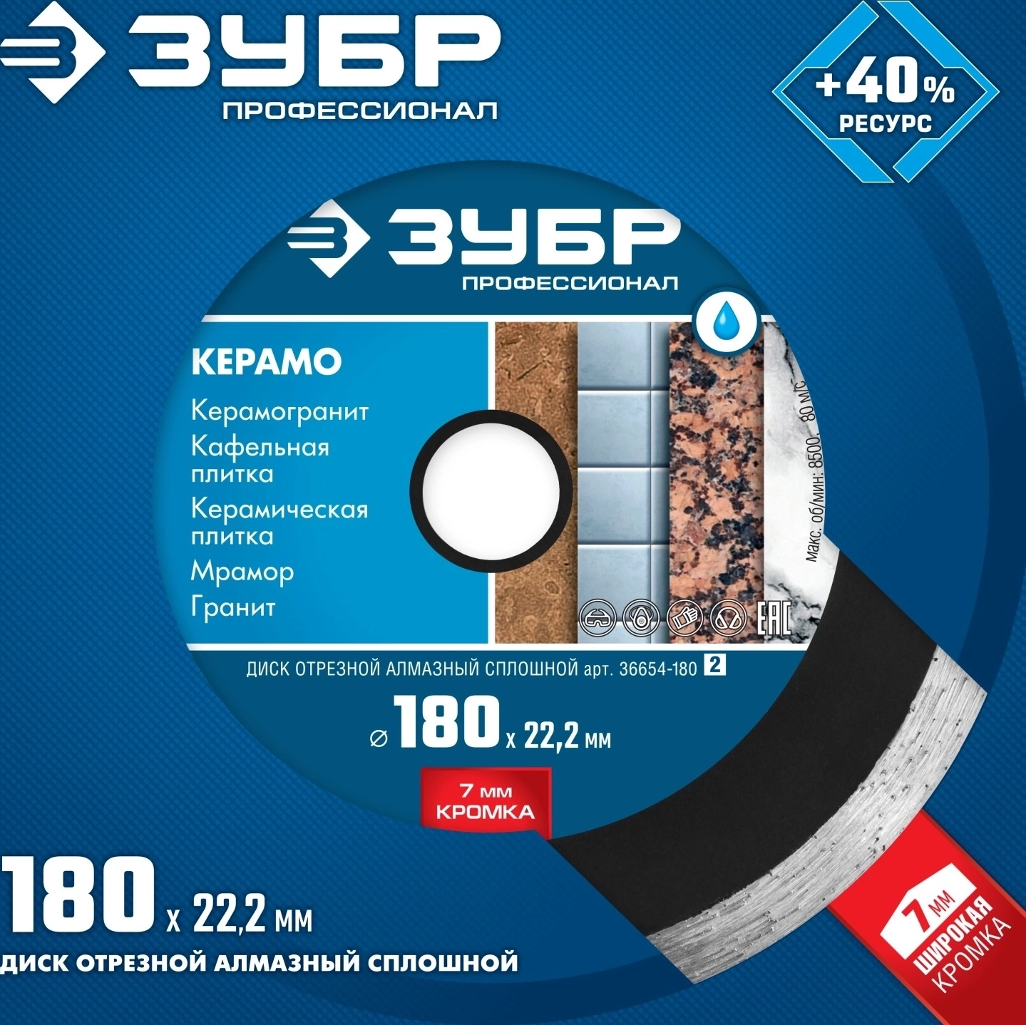 Сплошной алмазный диск ЗУБР Керамо-22 d 180 мм 22.2 мм 7 х 2.2 мм