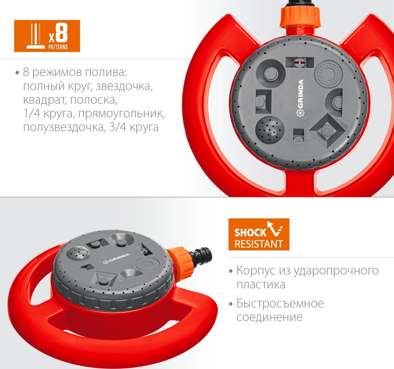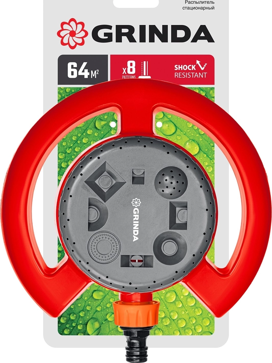 Стационарный распылитель GRINDA GF-8, 8 режимов полива, на облегченной подставке, пластиковый