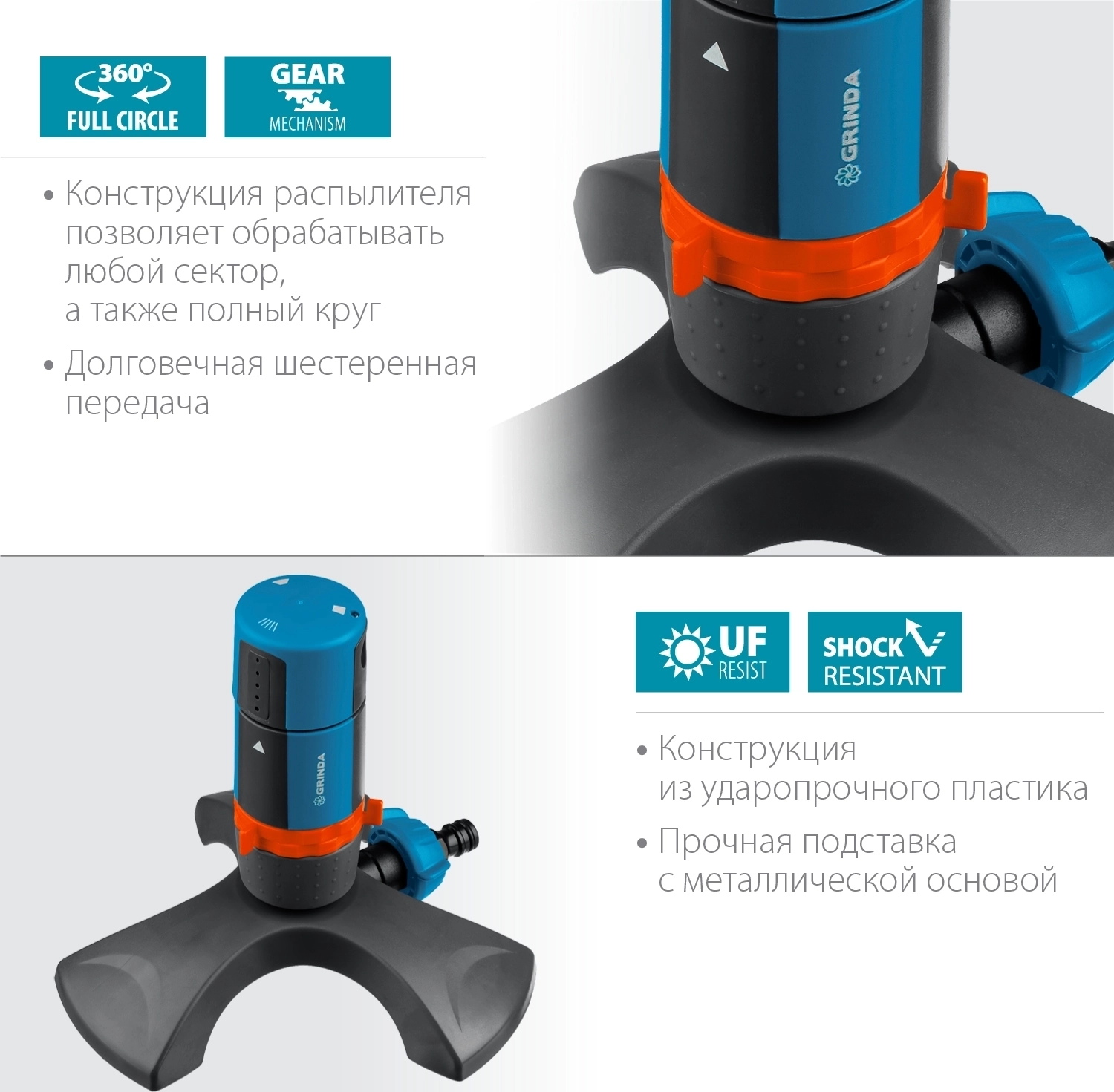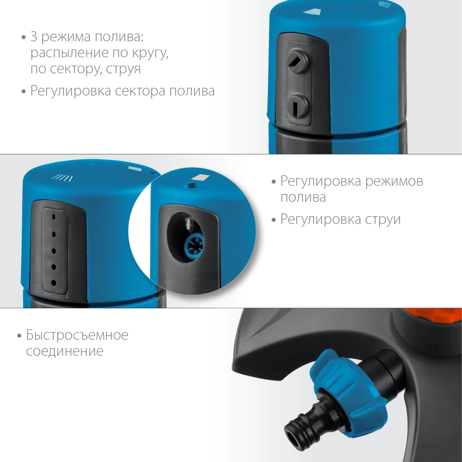 - 3 настраиваемых режима полива: распыление по кругу и по сектору
