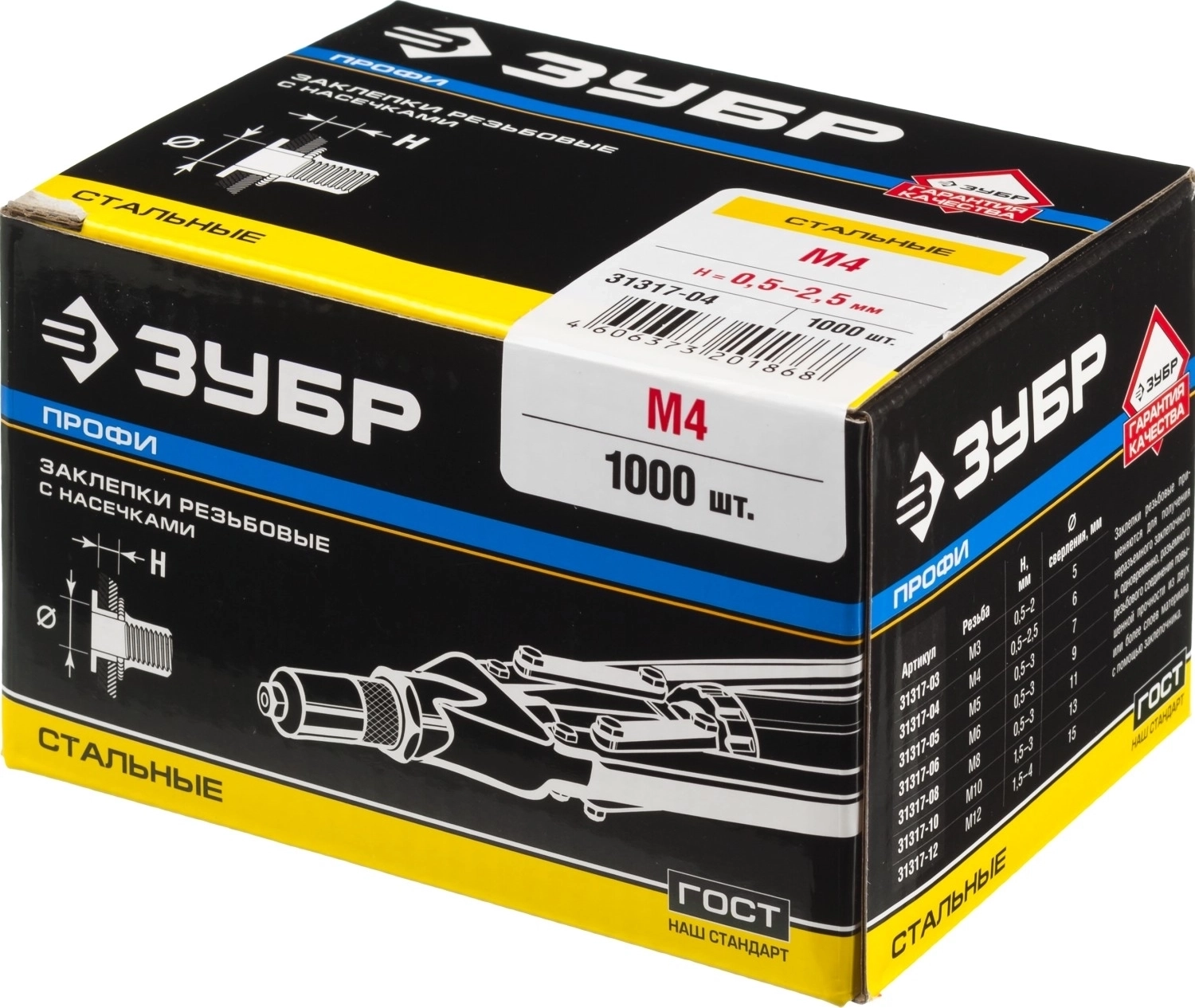 Стальные резьбовые заклепки с насечками ЗУБР М4 станд. бортик 1000 шт