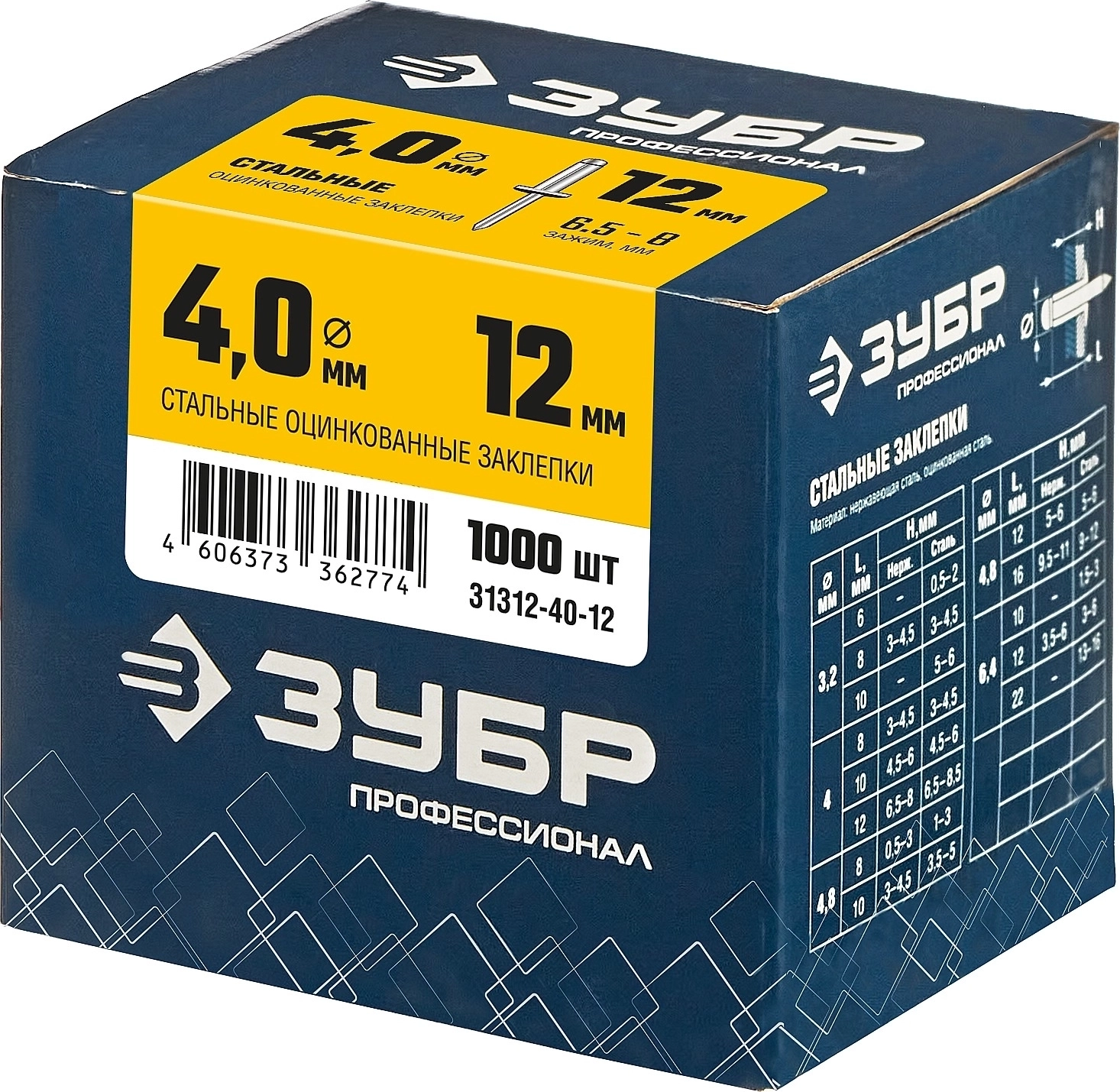 Стальные заклепки ЗУБР 4.0 x 12 мм 1000 шт