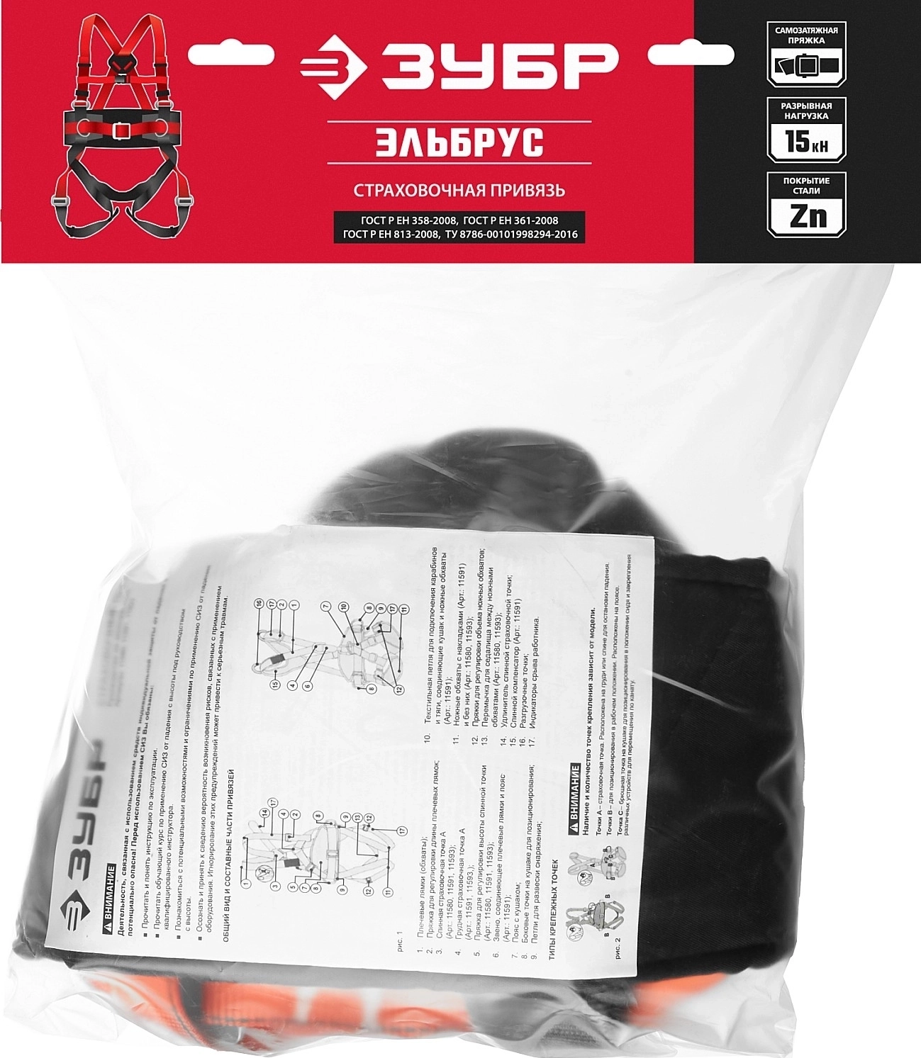 Страховочная и удерживающая привязь ЗУБР ЭЛЬБРУС фурнитура из оцинкованной стали, 3 точки крепления, размер L (1140-1440)