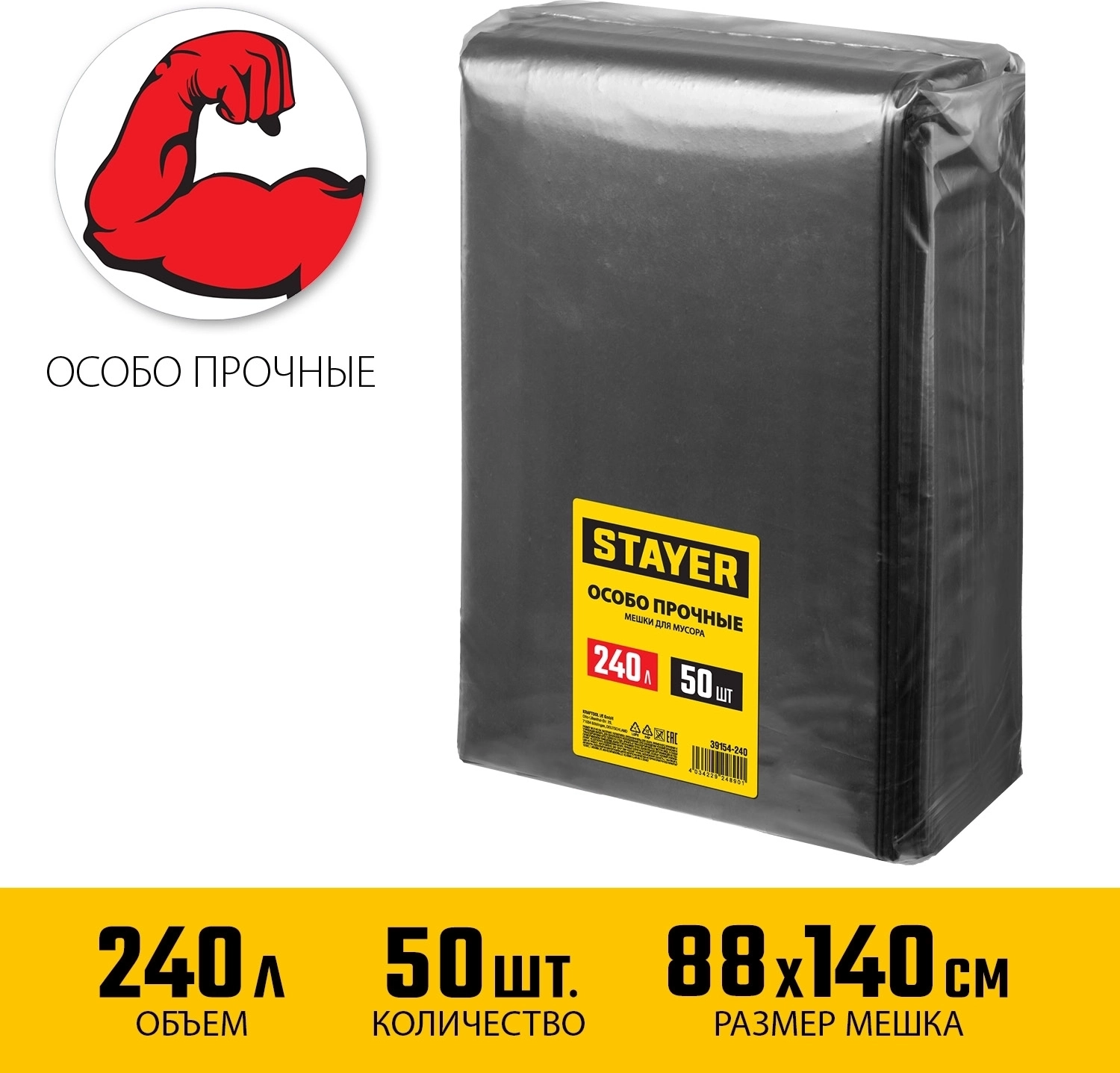Строительные мусорные мешки STAYER HEAVY DUTY, 240 л, 50 шт, черные, особопрочные
