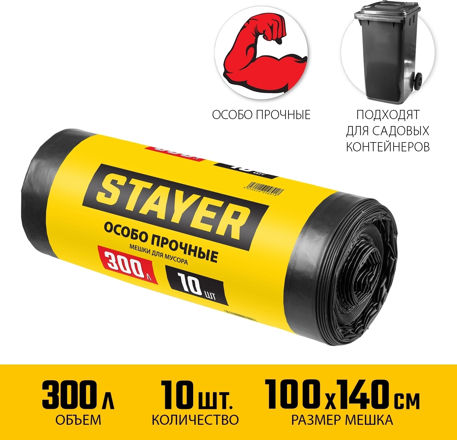 Строительные мусорные мешки STAYER HEAVY DUTY, 300 л, 10 шт, черные, особопрочные