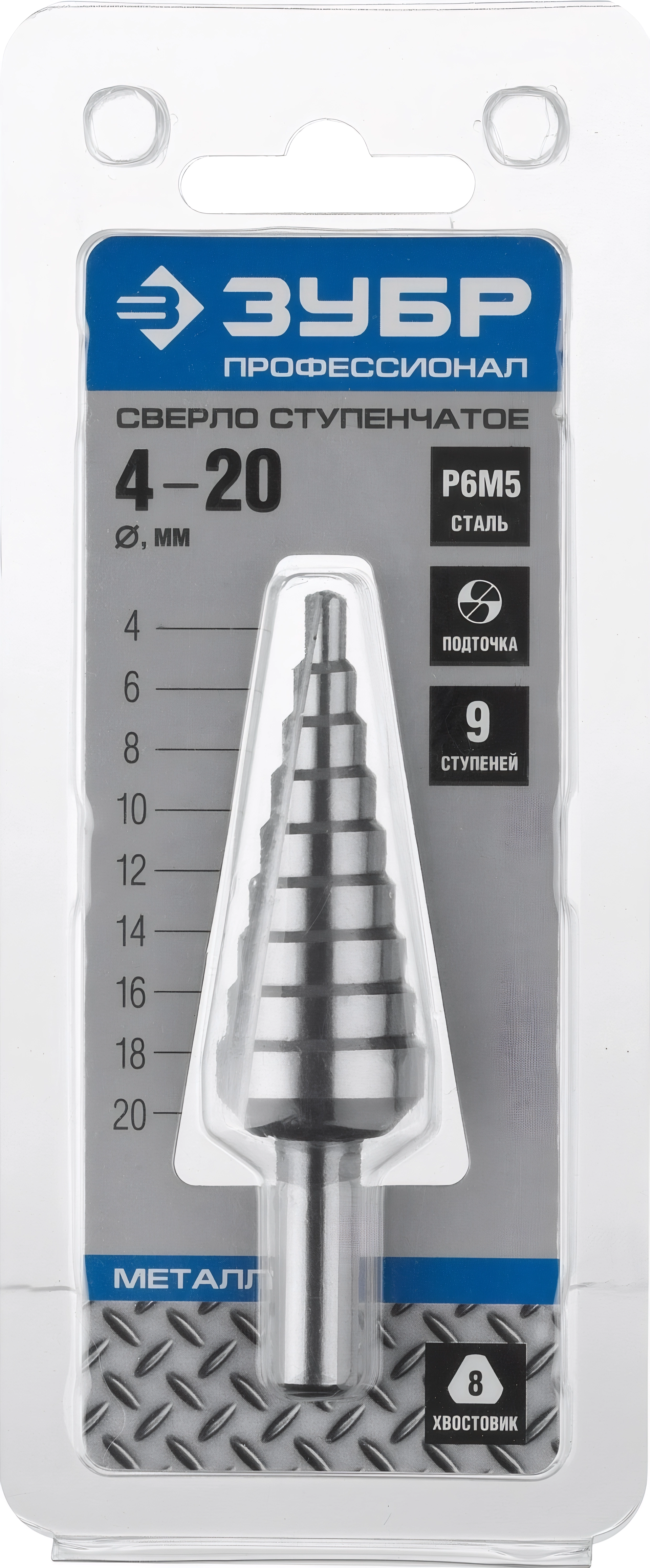 Ступенчатое сверло ЗУБР 4-20 мм 9 ступеней сталь Р6М5