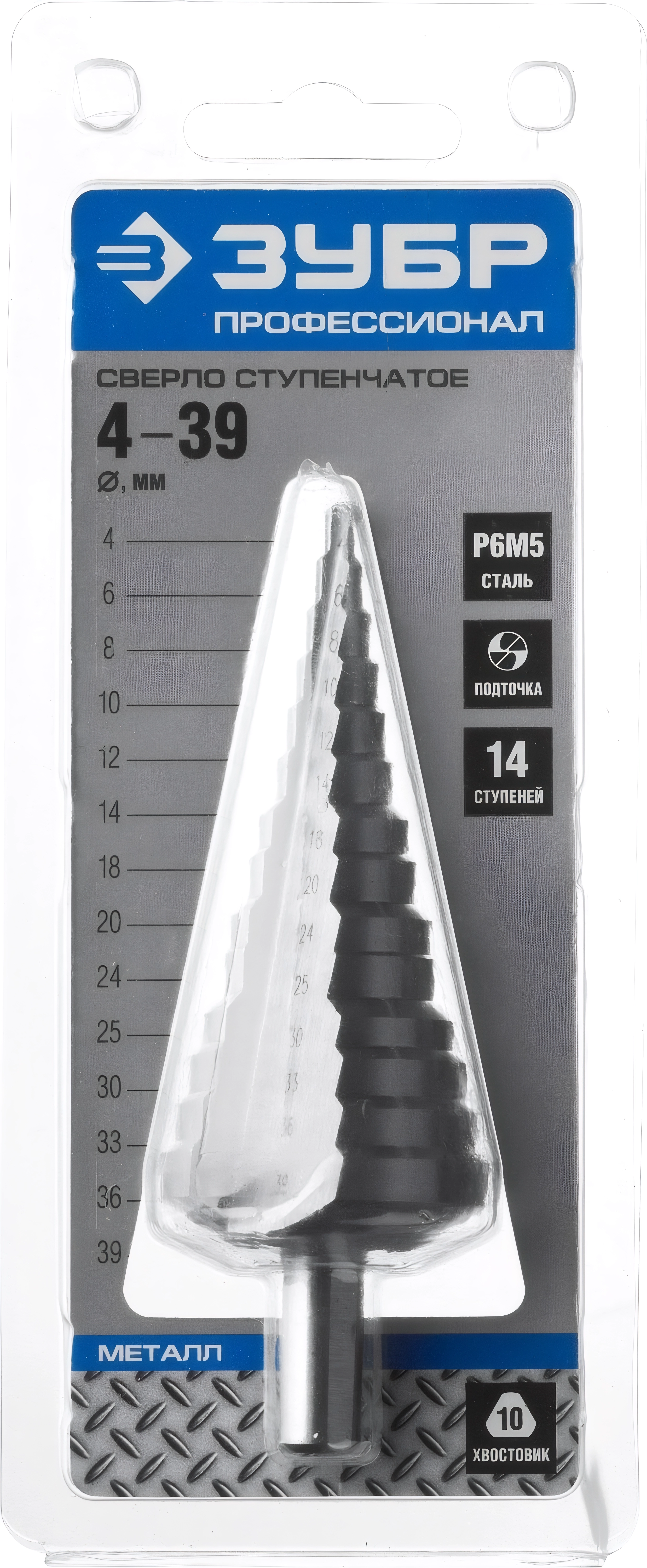 Ступенчатое сверло ЗУБР 4-39 мм 14 ступеней сталь Р6М5
